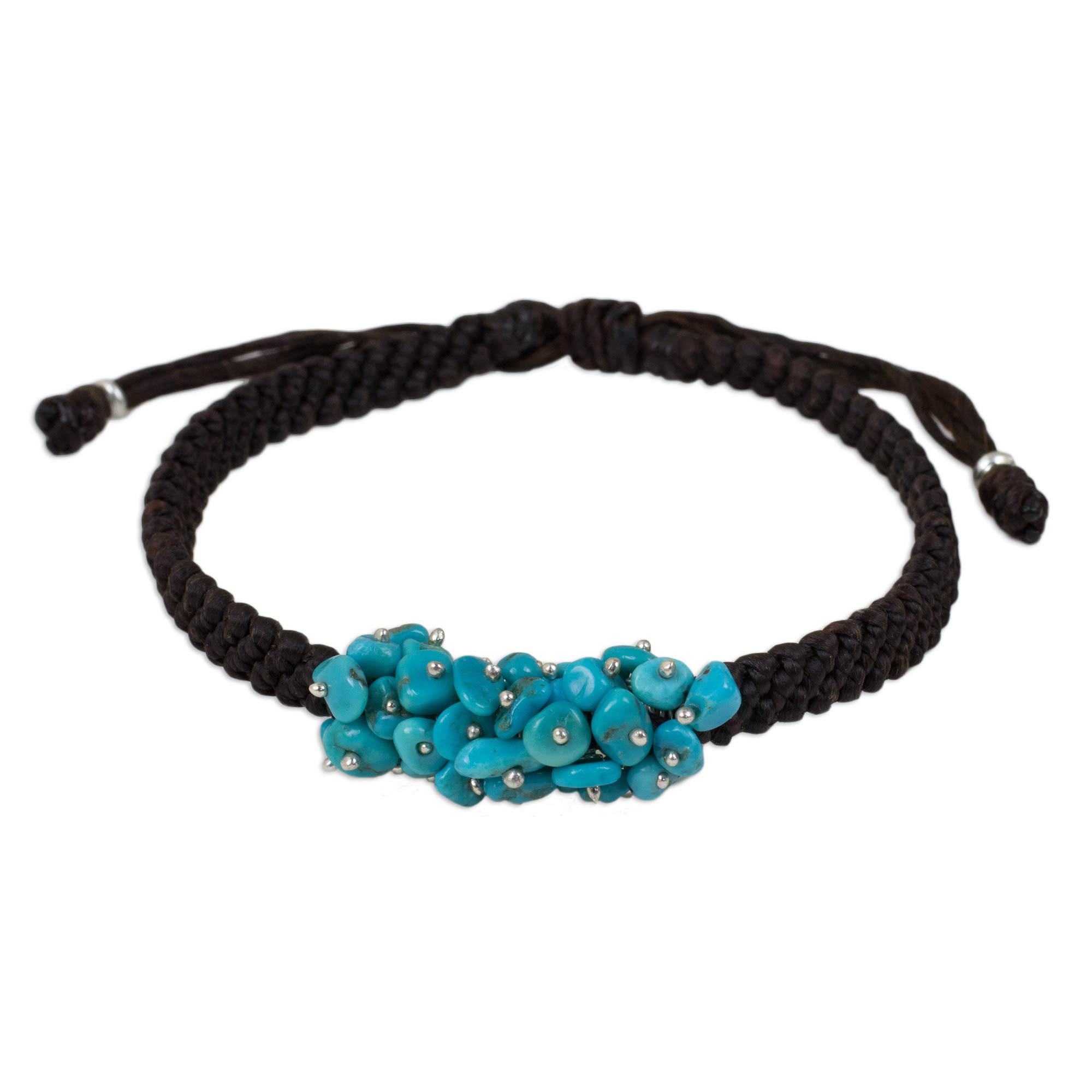 Perfect for a casual day out, this cord bracelet with reconstituted turquoise and sterling silver accents is hand crafted by Napapat of Thailand. She hand-braids brown waxed polyester cord and adorns it with reconstituted turquoise stones studded with tiny sterling silver beads. This bracelet featuring a sliding knot is inspired by the incredible craftsmanship of Thailand's hill tribe artisans.