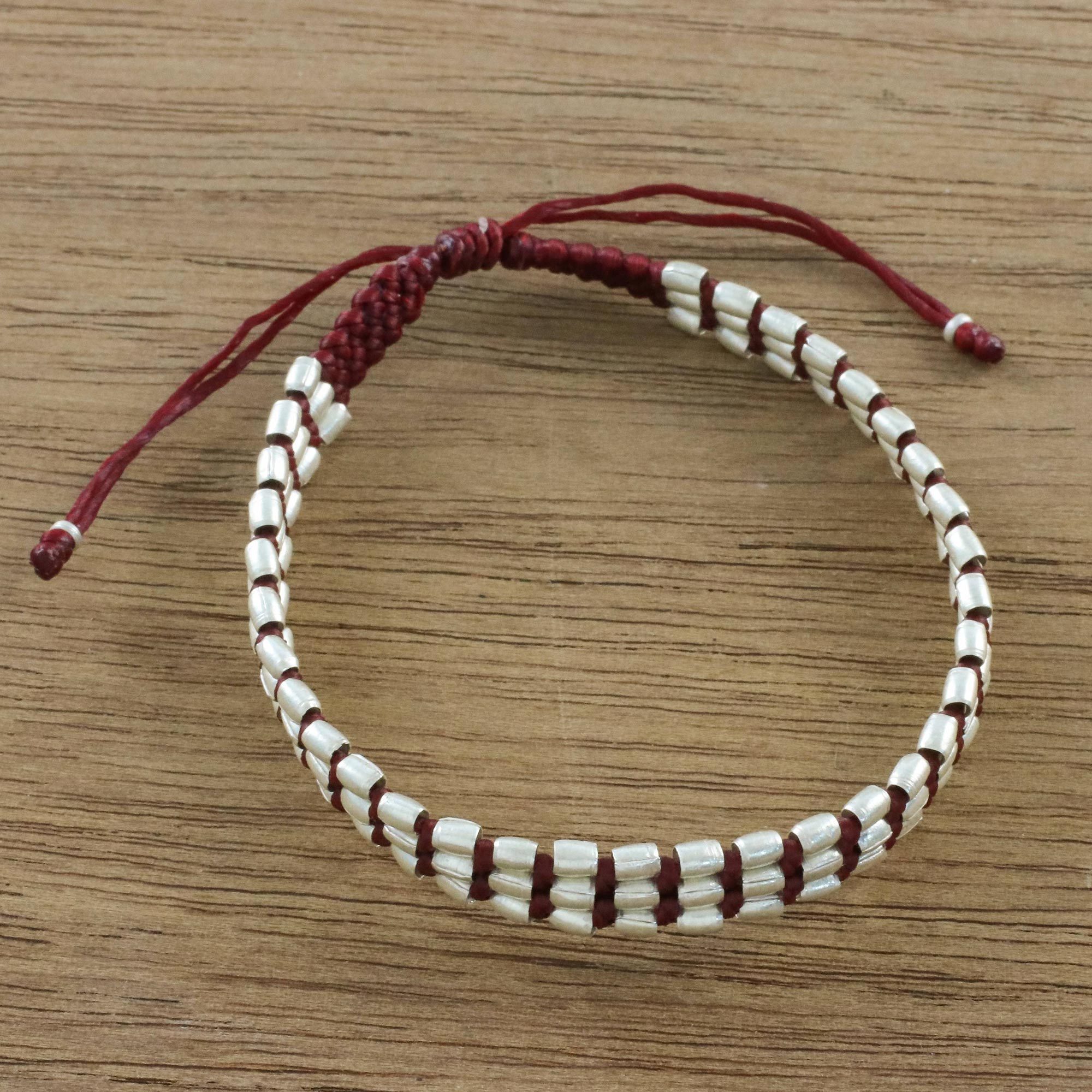 In an appealingly simple design, Napapat of Thailand creates a beaded cord bracelet. Deep red cords are hand-knotted with Karen hill tribe silver beads with a matte finish. The bracelet's length can be adjusted with the sliding knot.