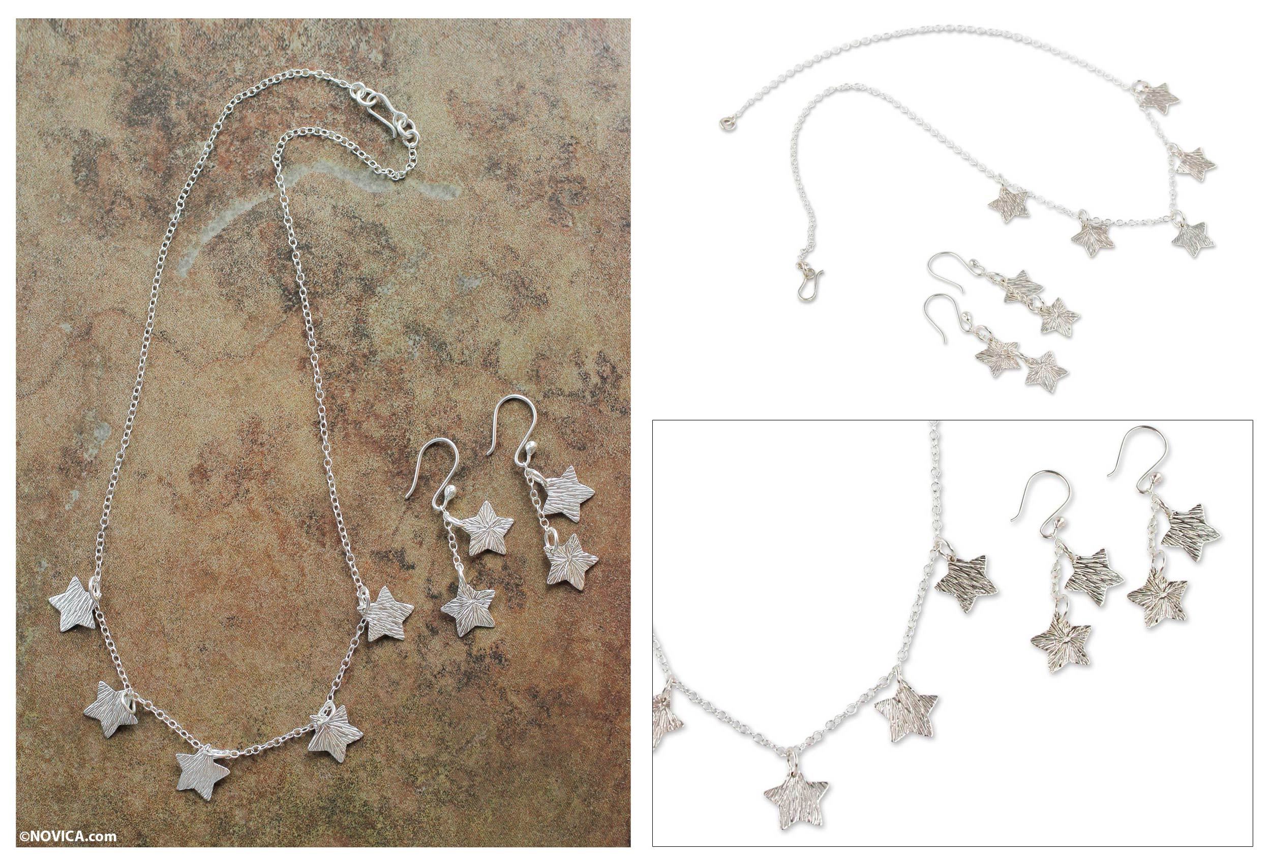 Handmade Silver Star Necklace and Earrings Set from Peru, 'Tears of San Lorenzo'