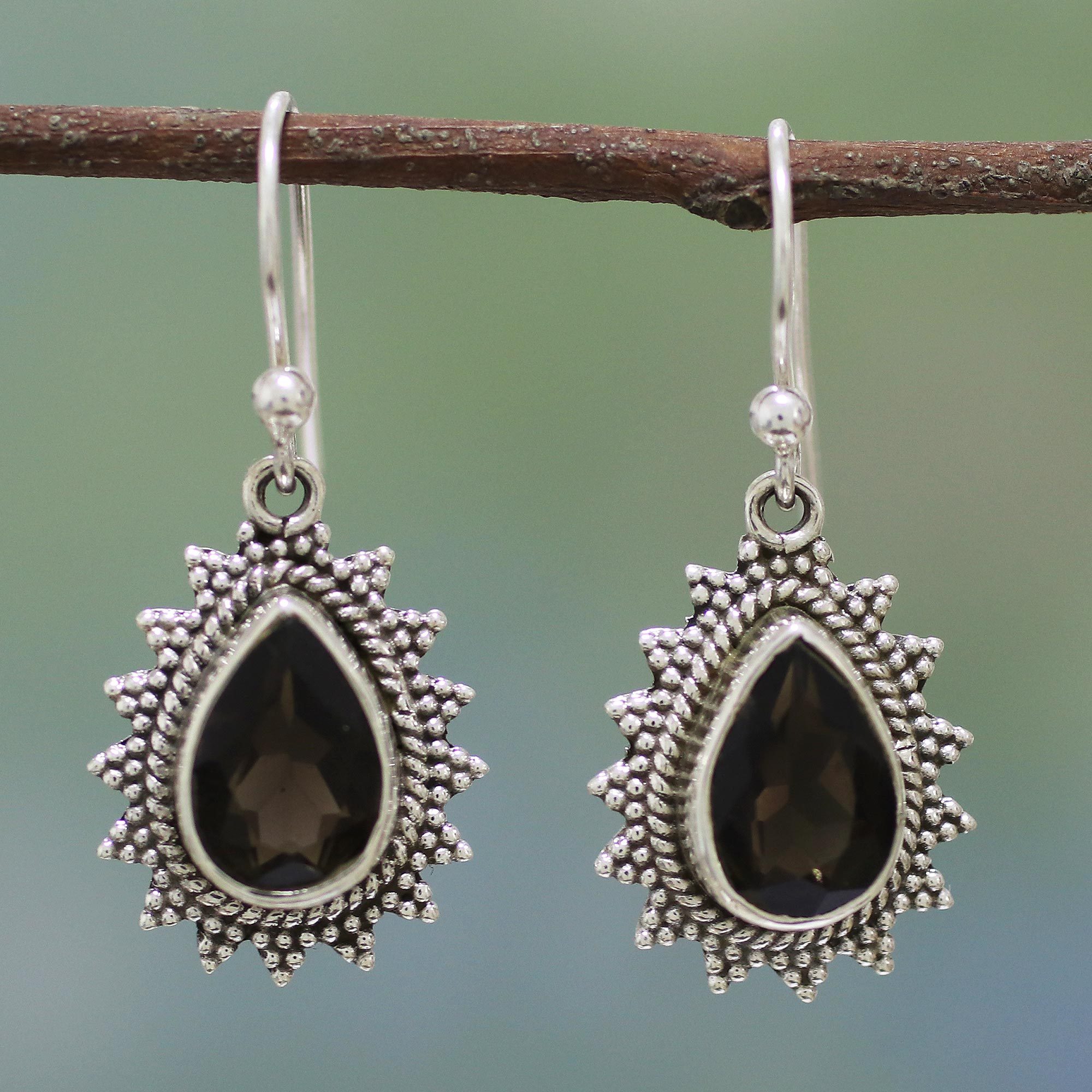 These gorgeous earrings are created by Parul of India. In the center of each earring is a two-carat smoky quartz that gleams warmly in the light. They are framed by elaborately crafted sterling silver bezels, resembling the flames from which the smoke may have risen, and they are completed with sterling silver hooks.