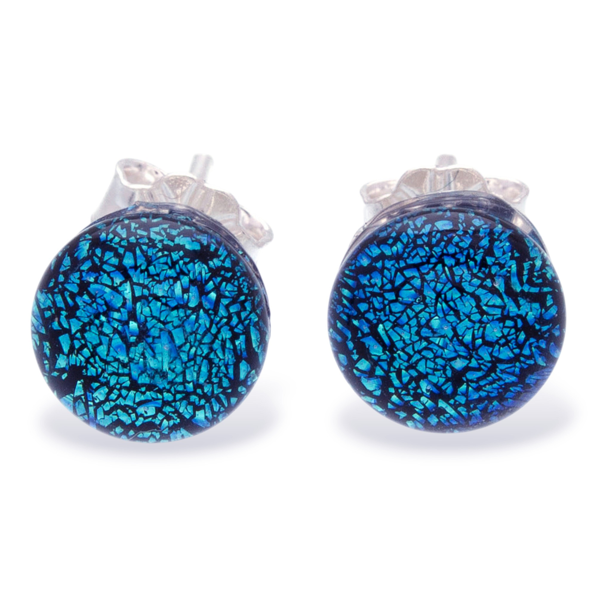 Handmade Sparkling Blue Dichroic Glass Silver Stud Earrings, 'Essential Azure'
