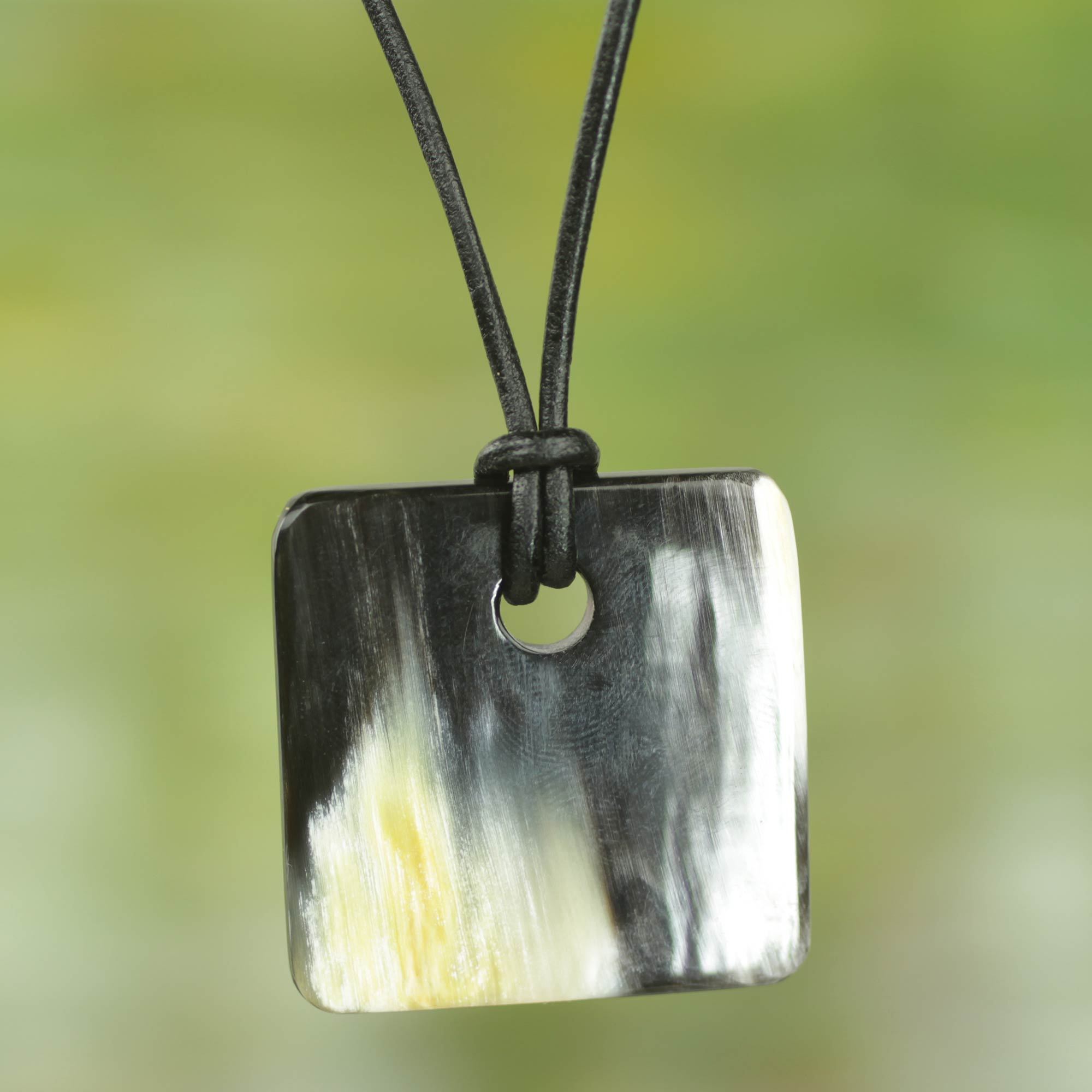 Handmade Square Bull Horn Pendant Necklace with Leather Cord, 'Breeze'