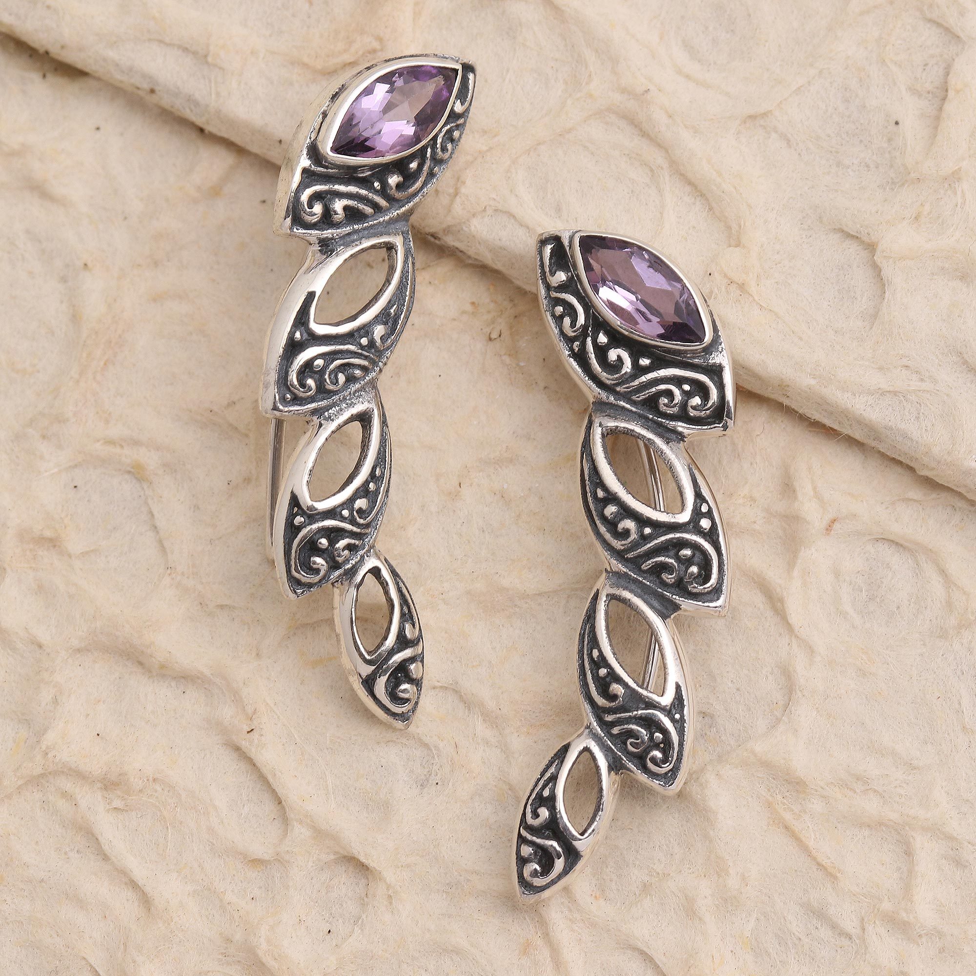 Hollow marquise shapes ascend your ear in these graceful ear climbers designed by Suar Dwipayana. Crafted from oxidized sterling silver, the earrings are adorned with swirling tendrils in a traditional Balinese design and pear-shaped amethyst stones in silver bezel settings.
