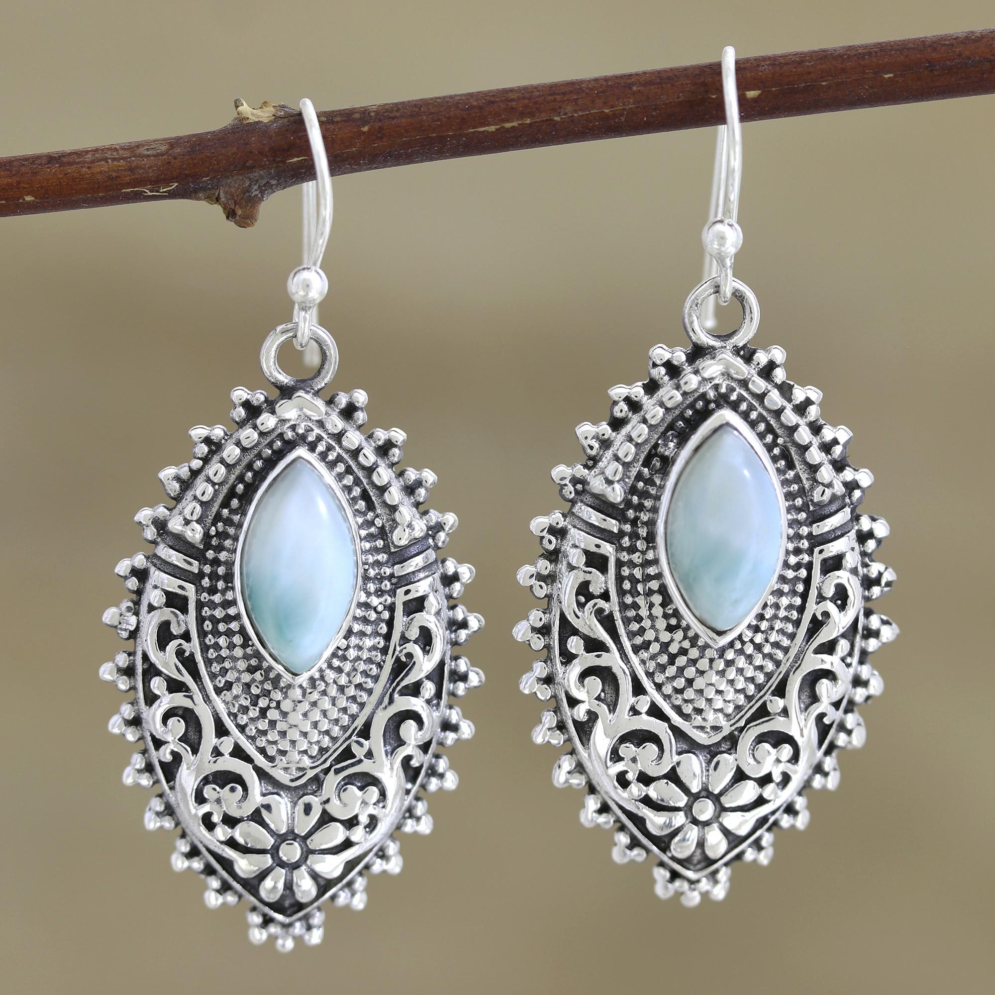 Smooth, marquise-shaped larimar gemstones rest within intricate sterling silver frames in this pair of dangle earrings from India's Rakesh Rana. A swirling floral pattern adds an air of elegance to the design, which is finished with a decorative dotted trim and silver hooks.