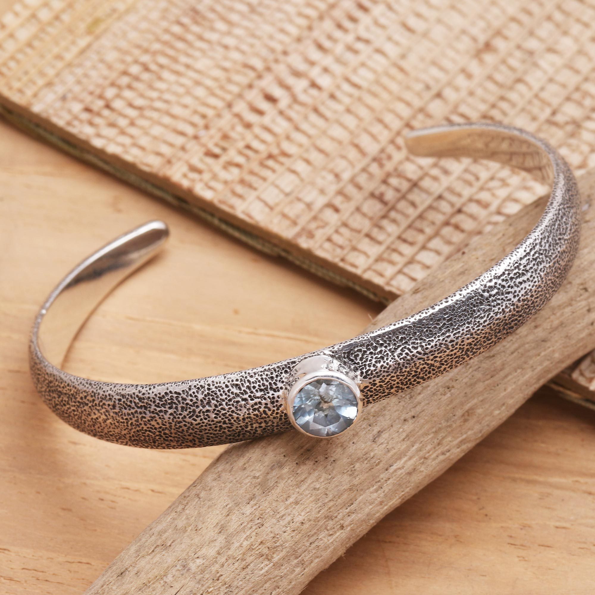 A single sparkling blue topaz gemstone in a round bezel setting takes center stage in this pretty cuff bracelet from Bali's Budiharta. Crafted from sterling silver, the bracelet features oxidized stippling on the top and a high-polish finish underneath.