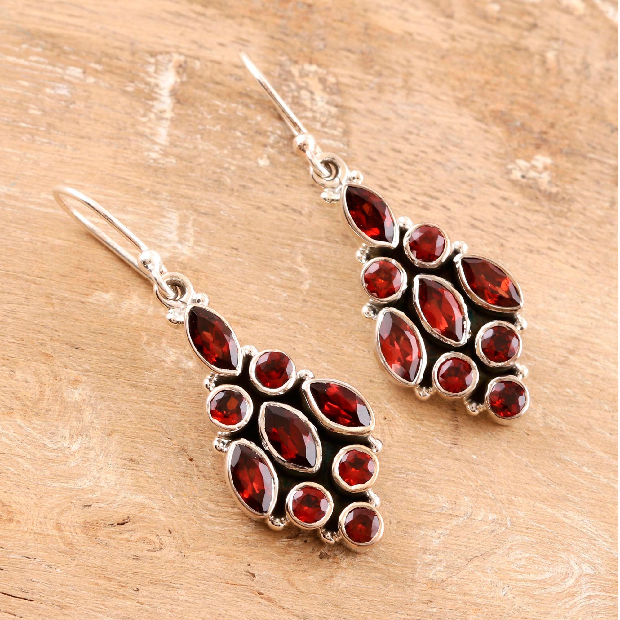 Balance energy and cultivate passion with the power of rich garnet. Indian artisan Alok Jain uses faceted garnet gems in round and marquise shapes to create a tower of sparkling gems, which swing prettily from shining sterling silver hooks.