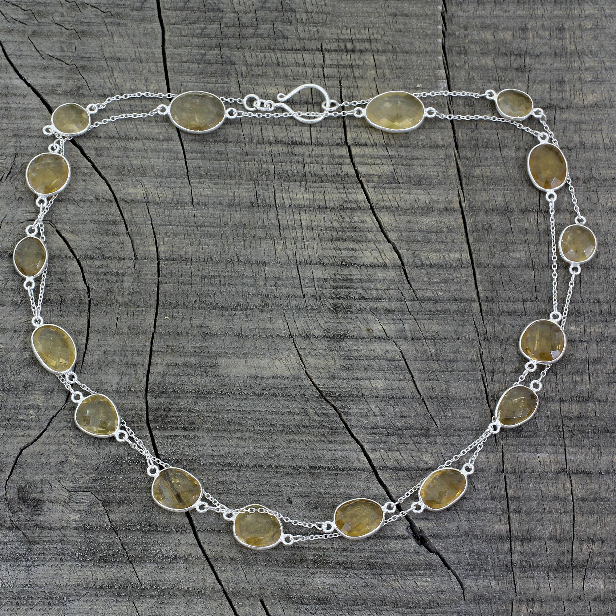 This necklace by Aparna mirrors the crystalline majesty of the Duduma waterfall, in the verdant lands of Orissa. Aparna handcrafts the long sterling silver bracelet with lemon quartz for an approximate total of 45 gemstone carats. The necklace can wrap around twice.