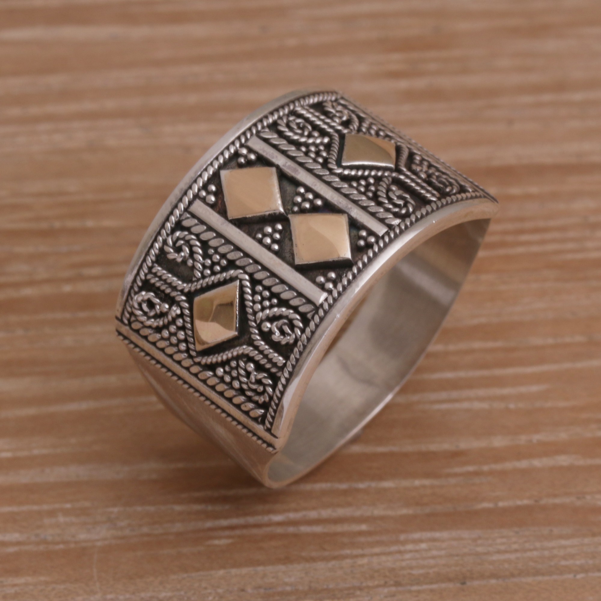 This wonderful cocktail ring is presented by Bali's Komang Wijayana. Crafted by hand from sterling silver, the beautiful ring is adorned with four diamond-shaped 18k gold accents which are flanked by a variety of attractive sterling silver dot motifs. The artisan uses oxidization to accentuate the majestic design.
