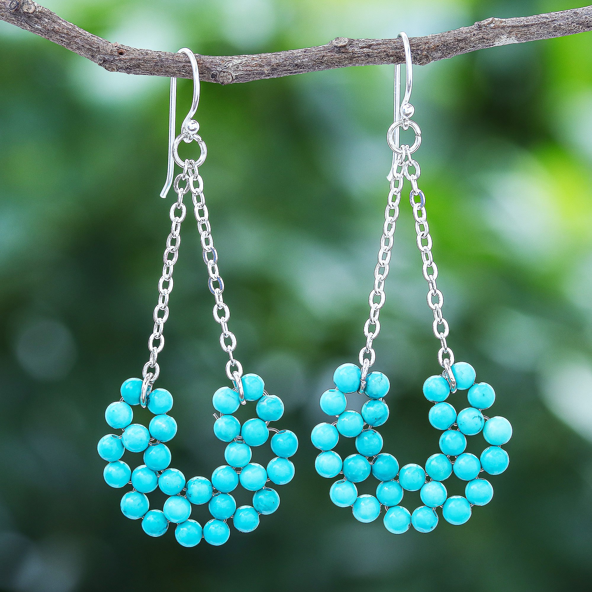 Start your day off right with this jolly pair of dangle earrings designed by Thai artisan Srimuang. Oodles of reconstituted turquoise beads form a semicircle that dangles delicately from a gleaming sterling silver chain and matching silver hooks.