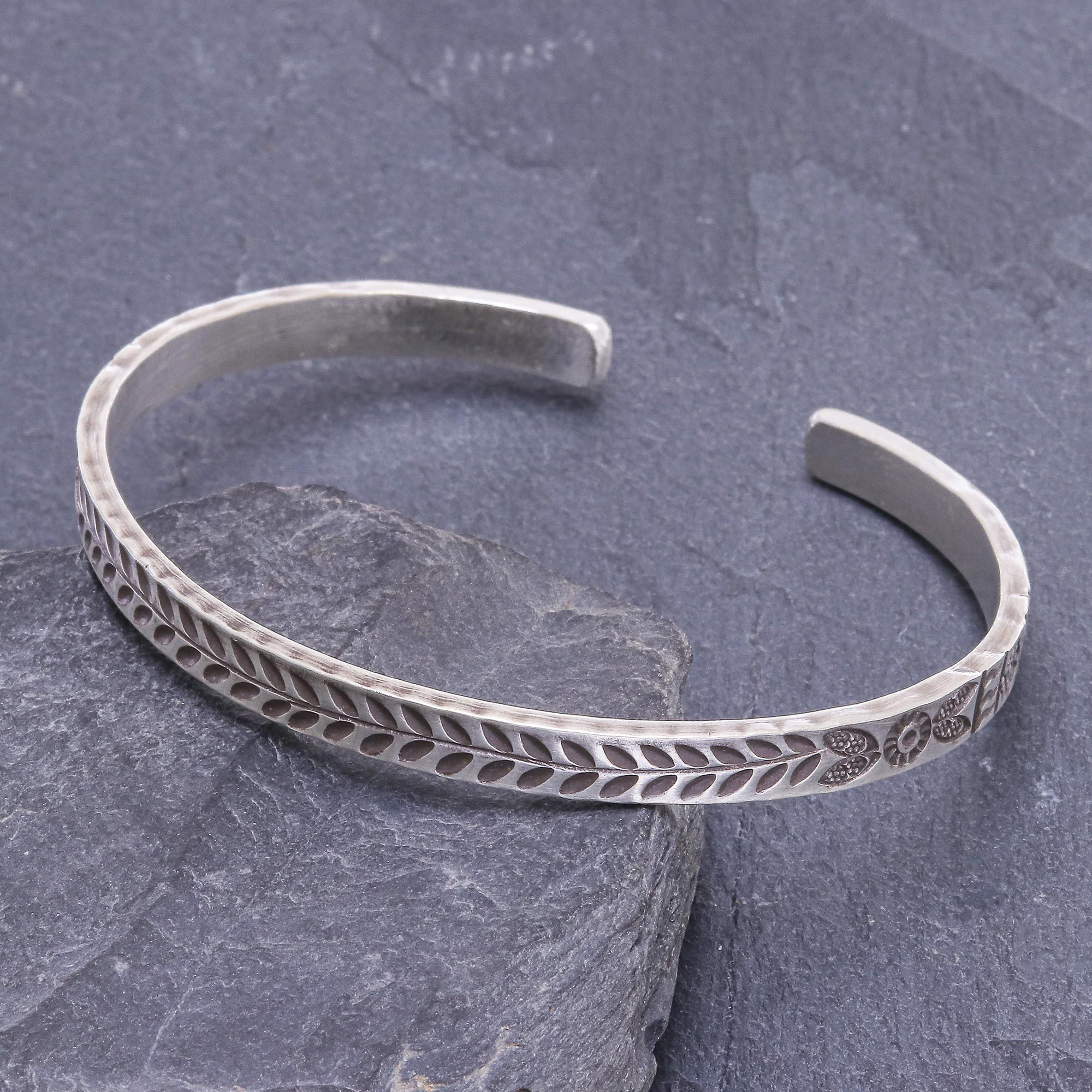 Fill your life with bright moments wearing this enchanting cuff bracelet from Thailand's Pakaon Sojintarit. Hand crafted in 925 sterling silver, the bracelet features a pretty leaf and flower motif in an oxidized finish.