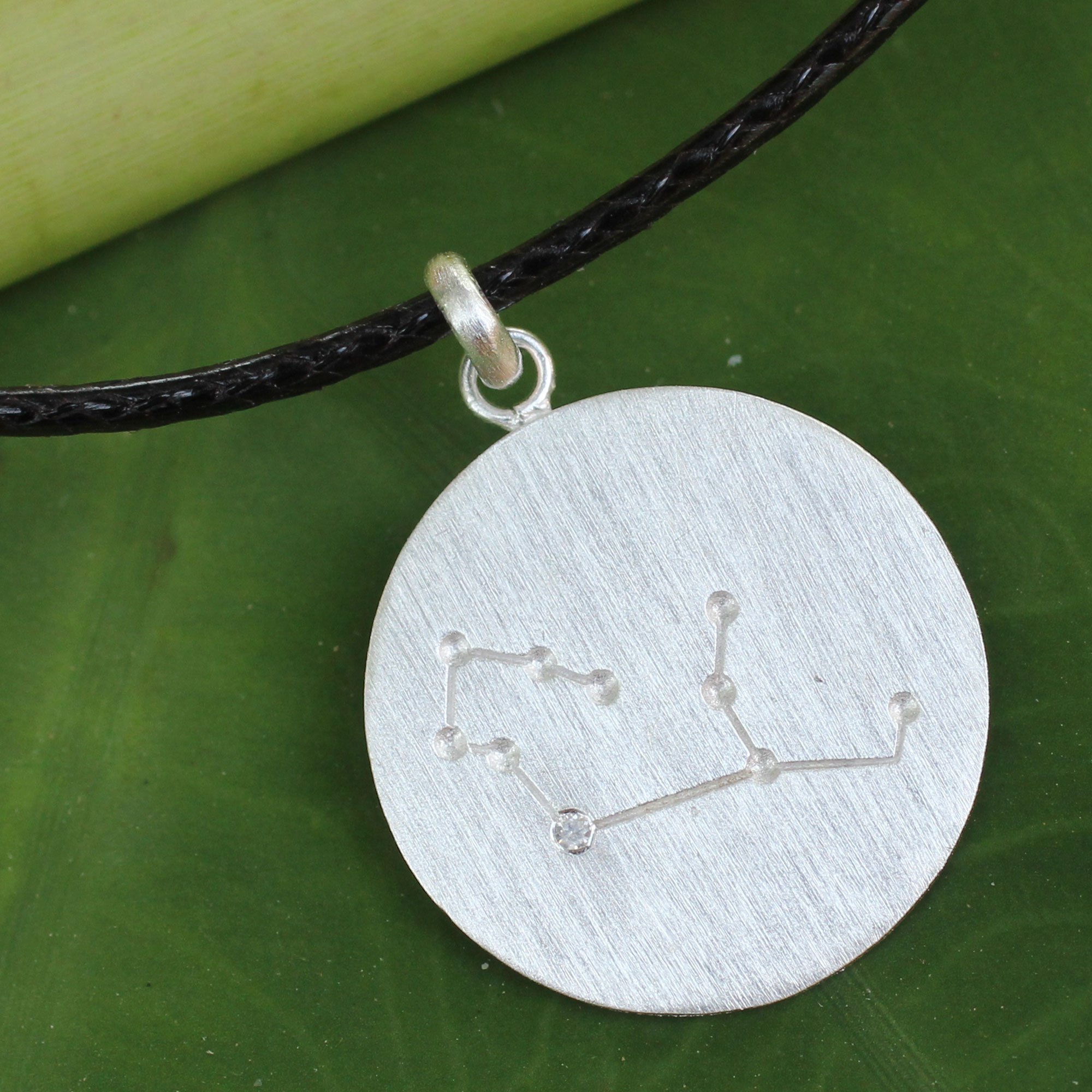 Etched in brushed silver, the constellation Virgo graces this pendant necklace from Thai artisan Sarote Lochotinunt. Spica, the brightest star in Virgo, is adorned with a sparkling white topaz. The pendant is centered on a waxed nylon cord.