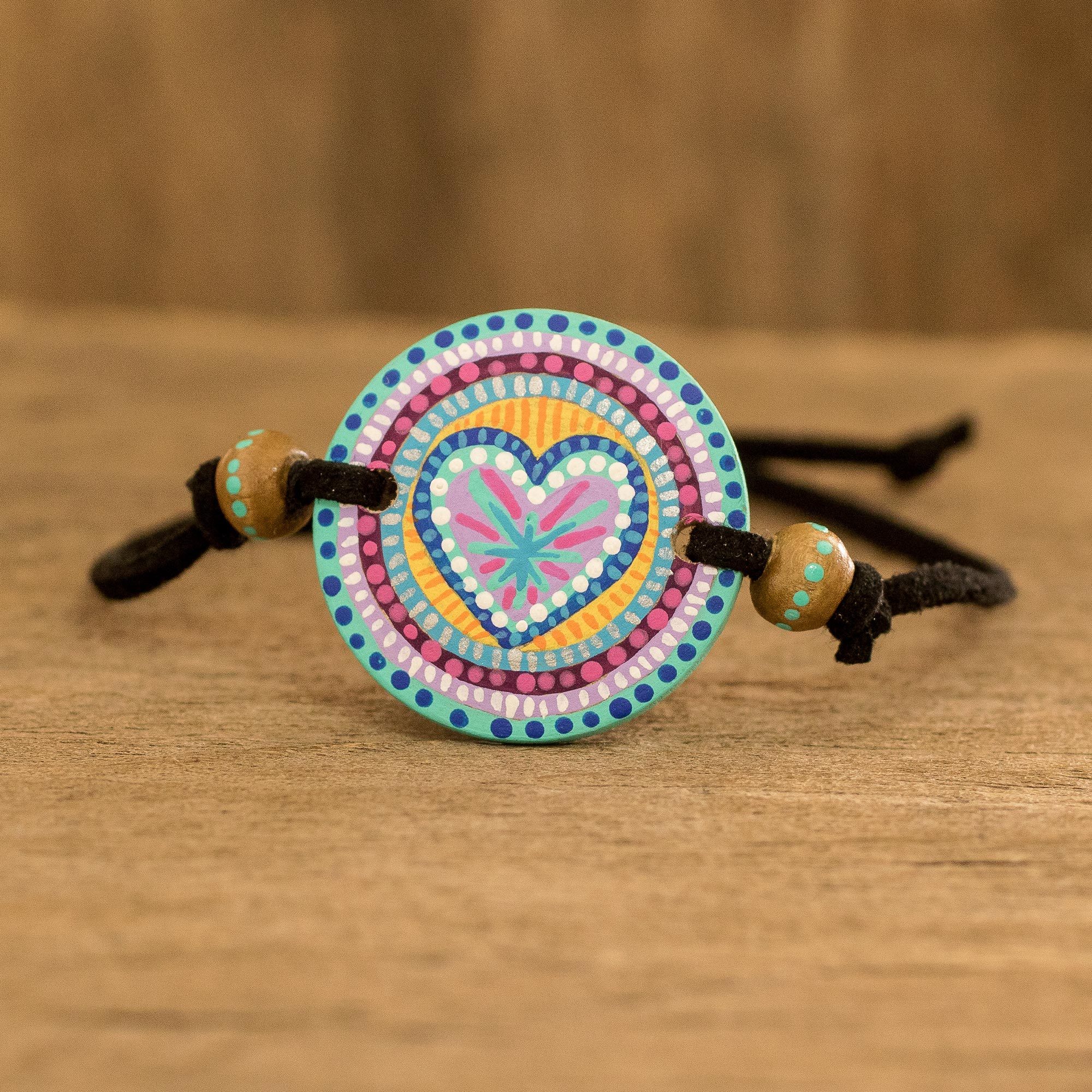 "These bracelets are inspired by love. The love that unites us all, and when it is real, does not differentiate, does not discriminate, does not exclude," says artisan Iliana Hernandez of her original jewelry designs. She hand-paints a colorful heart and mandala motif on a pinewood pendant, which centers a black faux suede cord of adjustable length.