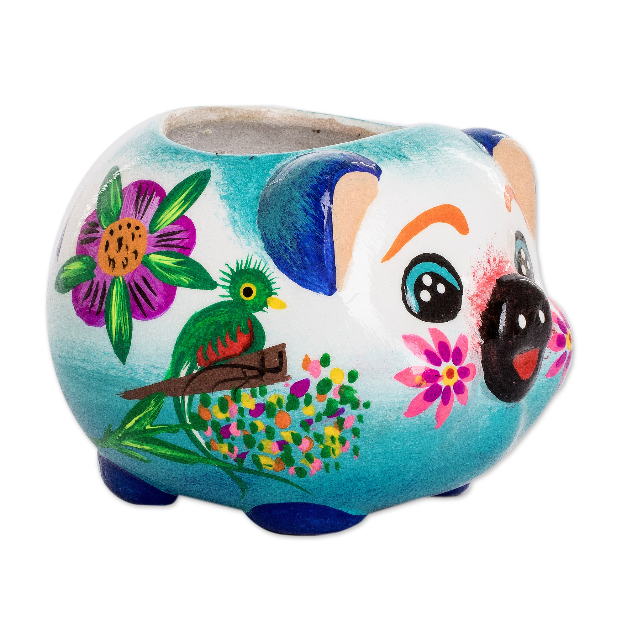 Handpainted Mini Ceramic Pig Flower Pot from Guatemala, 'Herbaceous Piglet'