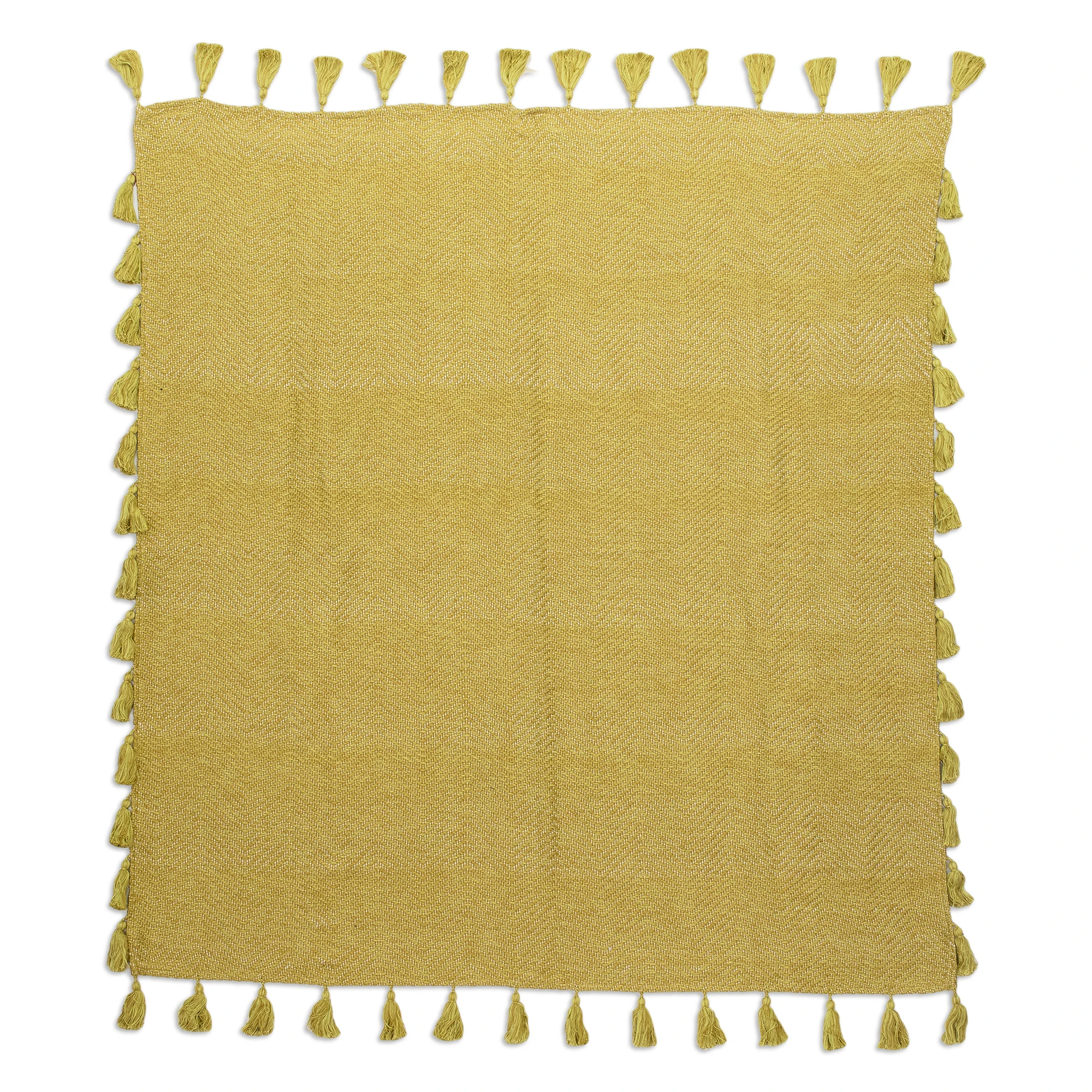 Handwoven Geometric Cotton Throw in Yellow with Tassels, 'Chic Chartreuse'