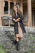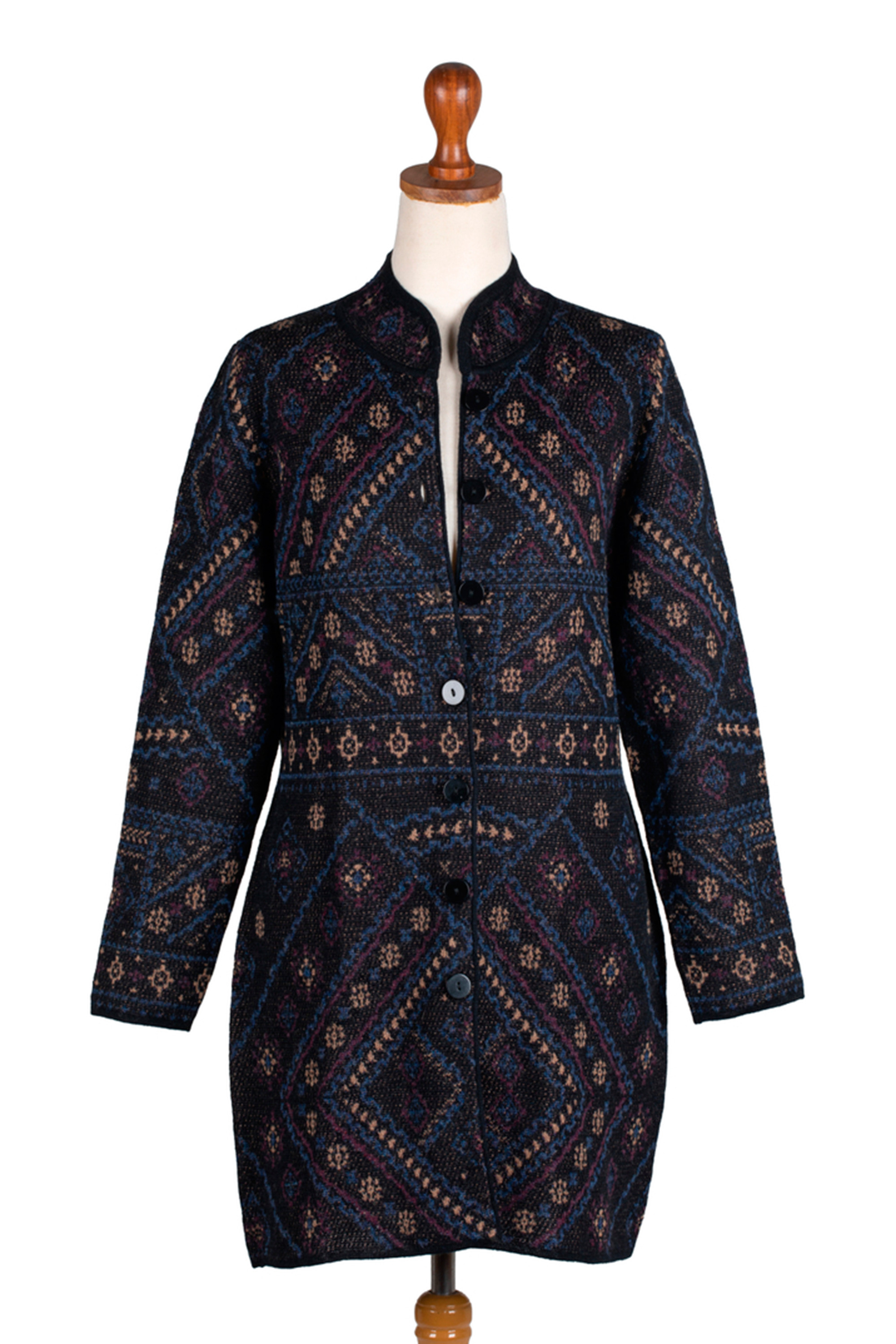 Peru's textile artistry lands on winter's new trends. Made of soft baby alpaca yarns, Ana Fernandez's Nordic-inspired cardigan gives the first step to a dapper ensemble. Its long cut is decorated with a handwoven pattern of blue, beige, and purple hues on a black base tone. Long sleeves, a button-up closure, and a mandarin collar ensure a fitted look, ideal for a versatile wardrobe.