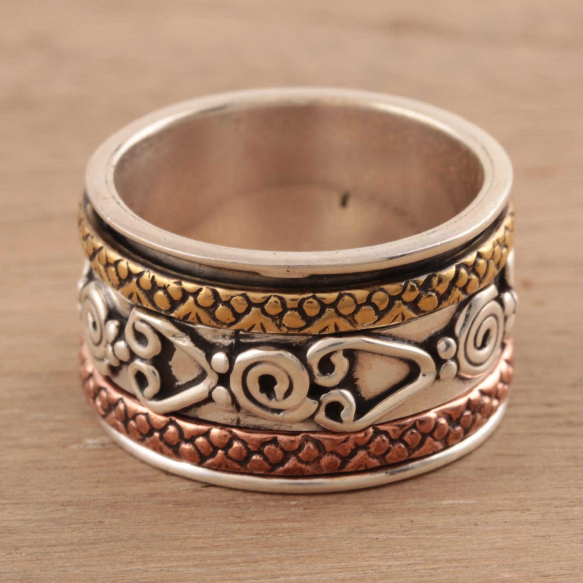 Crafted by hand, swirl and heart patterns of sterling silver are flanked by patterned bands of brass and copper. Shivani Choudhary designs this Indian spinner ring, which circles the finger with a wide band of sterling silver.