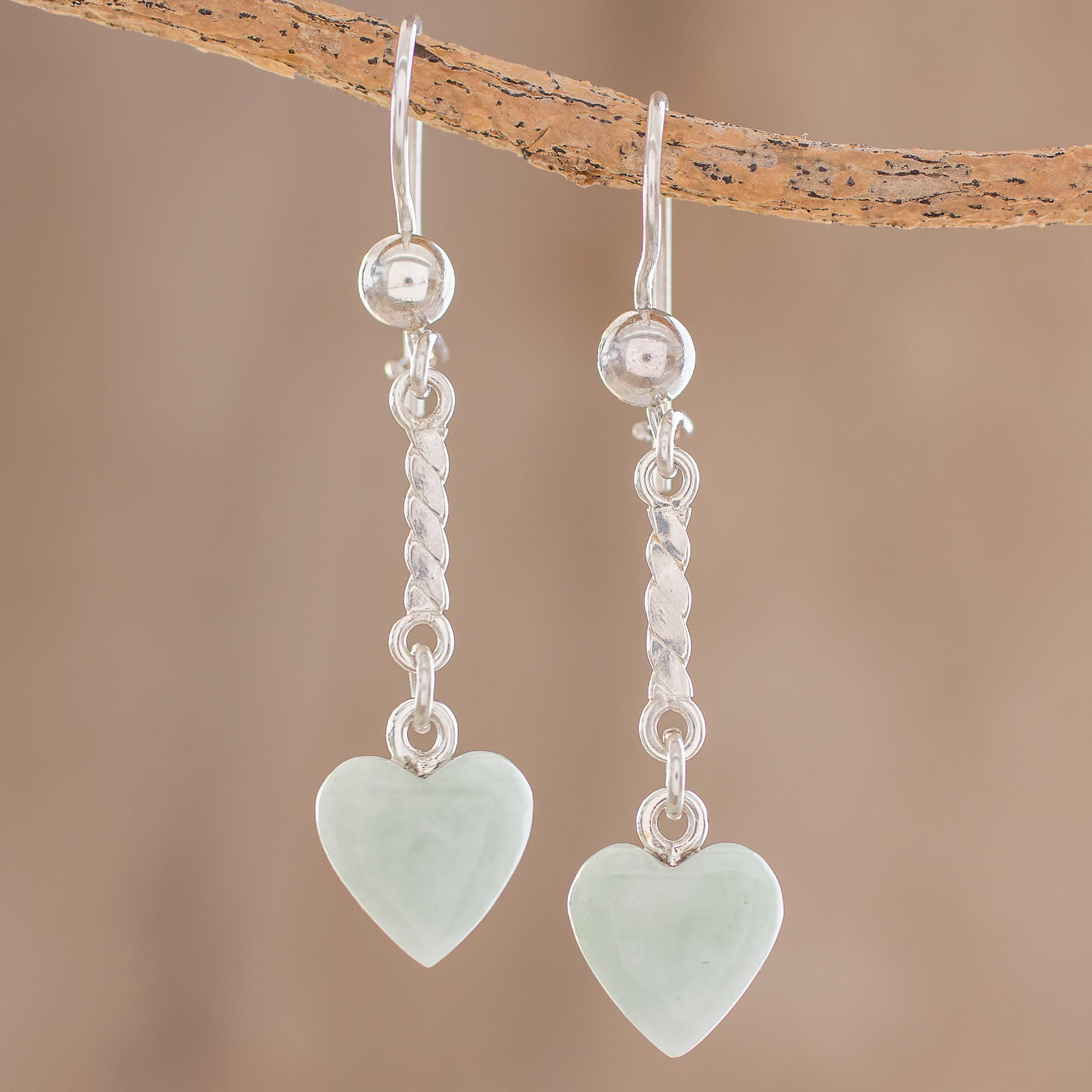 Known as ya'ax chich by the ancient Mayans, Guatemalan jade is a marvelous stone that evokes pre-Hispanic cultures and religions. Zandra Lorena Sajbin designs this pair of dangle earrings, featuring spirals of sterling silver that host two hearts carved of apple green jade.