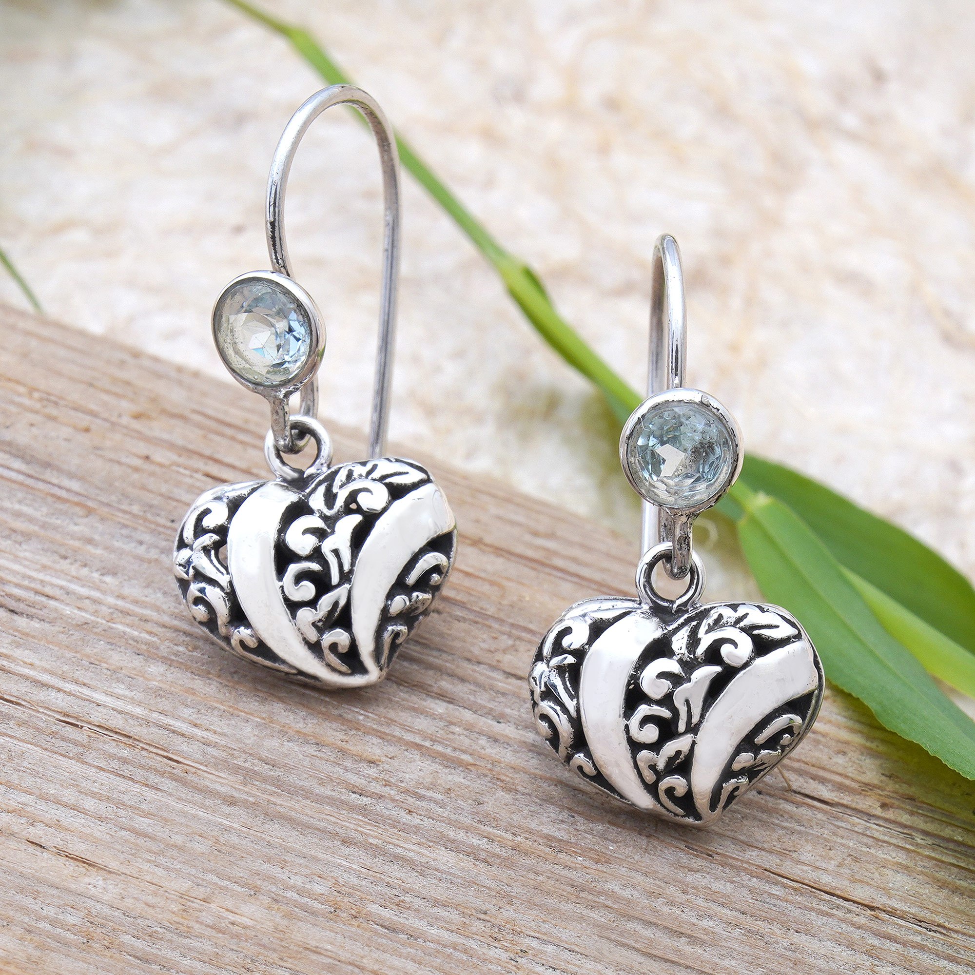 Glinting with the vivid sparkle of blue topaz, these sterling silver dangle earrings are a dance of artistry and nature. The heart-inspired design, accented with openwork and a mix of polished and oxidized details, gives the accessories a dynamic, layered look. Ekayani of Bali breathes a touch of tropical charm into this exquisite pair.