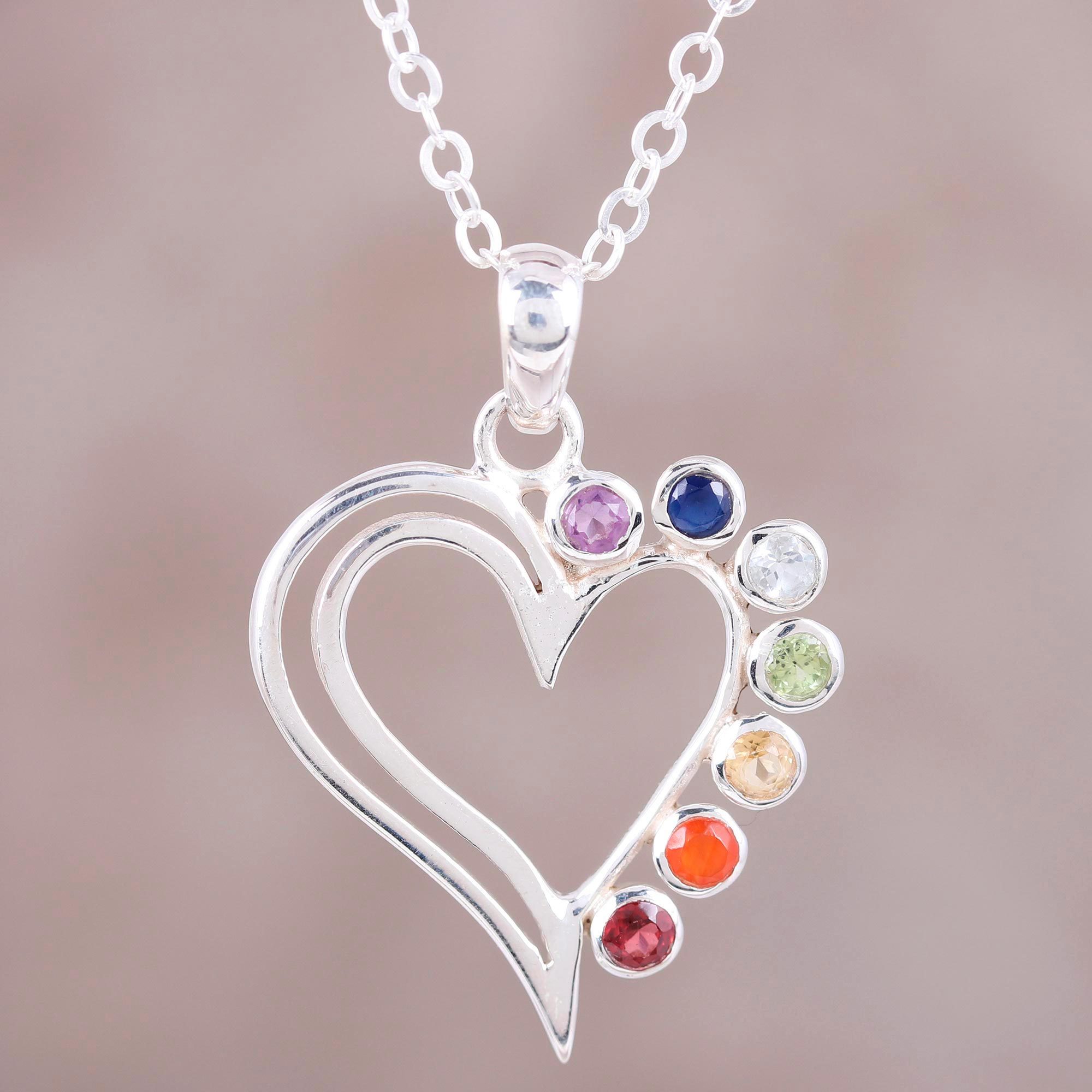 Heart-Shaped Multi-Gemstone Chakra Necklace from India, 'Balanced Heart'