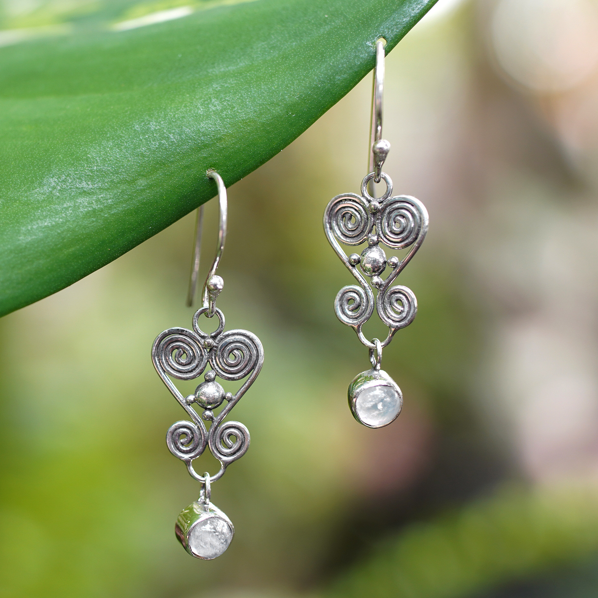 Spirals flow together in fanciful hearts to hang from sterling wires. These enchanting earrings by Nyoman Rena are set with flirty rainbow moonstone.