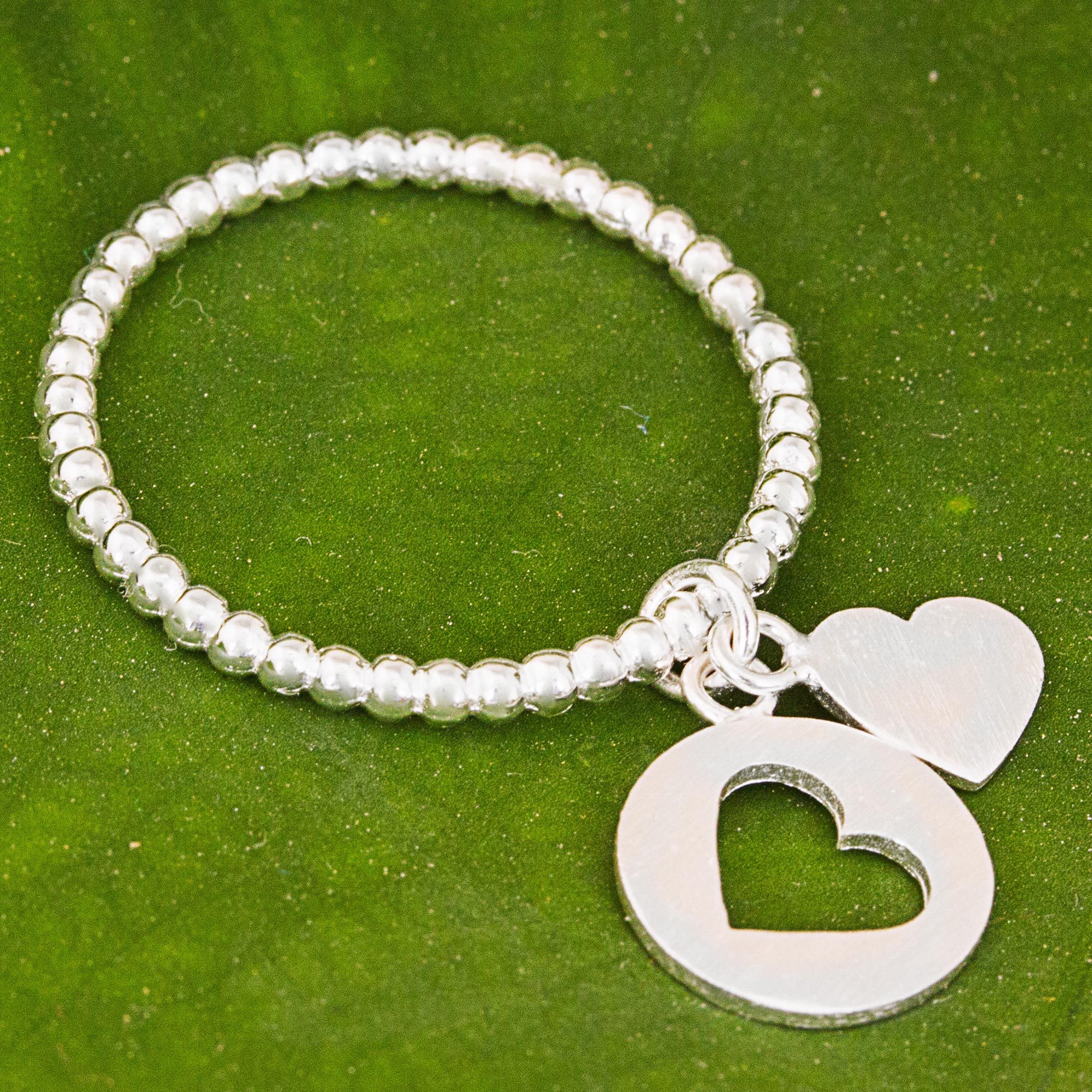 Walking in the footsteps of her parents, Thai artisan Jantana is a designer of excellent jewelry. She presents this sterling silver ring with two heart-shaped charms with complementary designs. The charms feature her signature brushed satin finish.