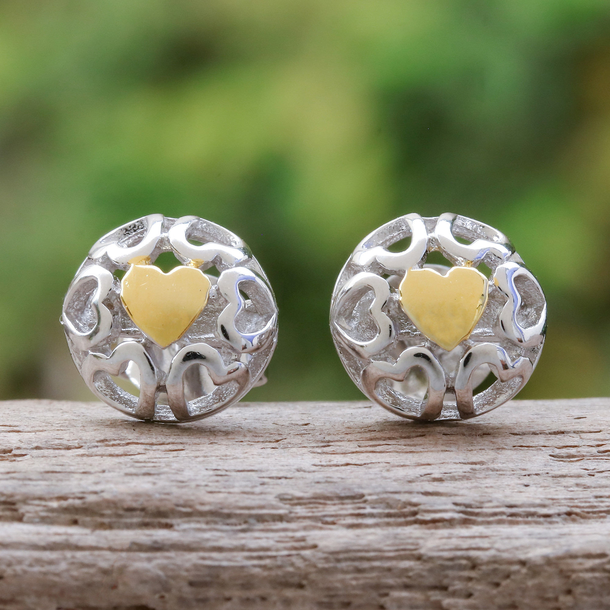 Heart-Themed 14k Gold-Accented Sterling Silver Stud Earrings, 'My Golden Love'