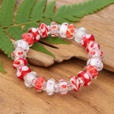 Brighten your wrist with this vibrant stretch bracelet handcrafted using traditional handblown glass techniques. The beads shimmer with rich red and white shades and intricate heart, floral and leaf patterns, creating a playful yet elegant accent for any outfit. Featuring delicate crystal beads, Thai artisan Alexx Cheng's eye-catching accessory tells a colorful story with each exquisite detail.