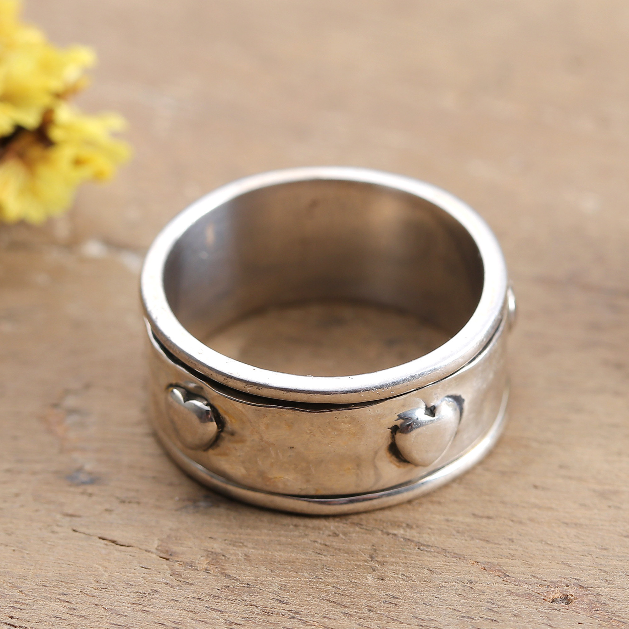 Heart-Themed Sterling Silver Meditation Spinner Ring, 'Rotating Hearts'
