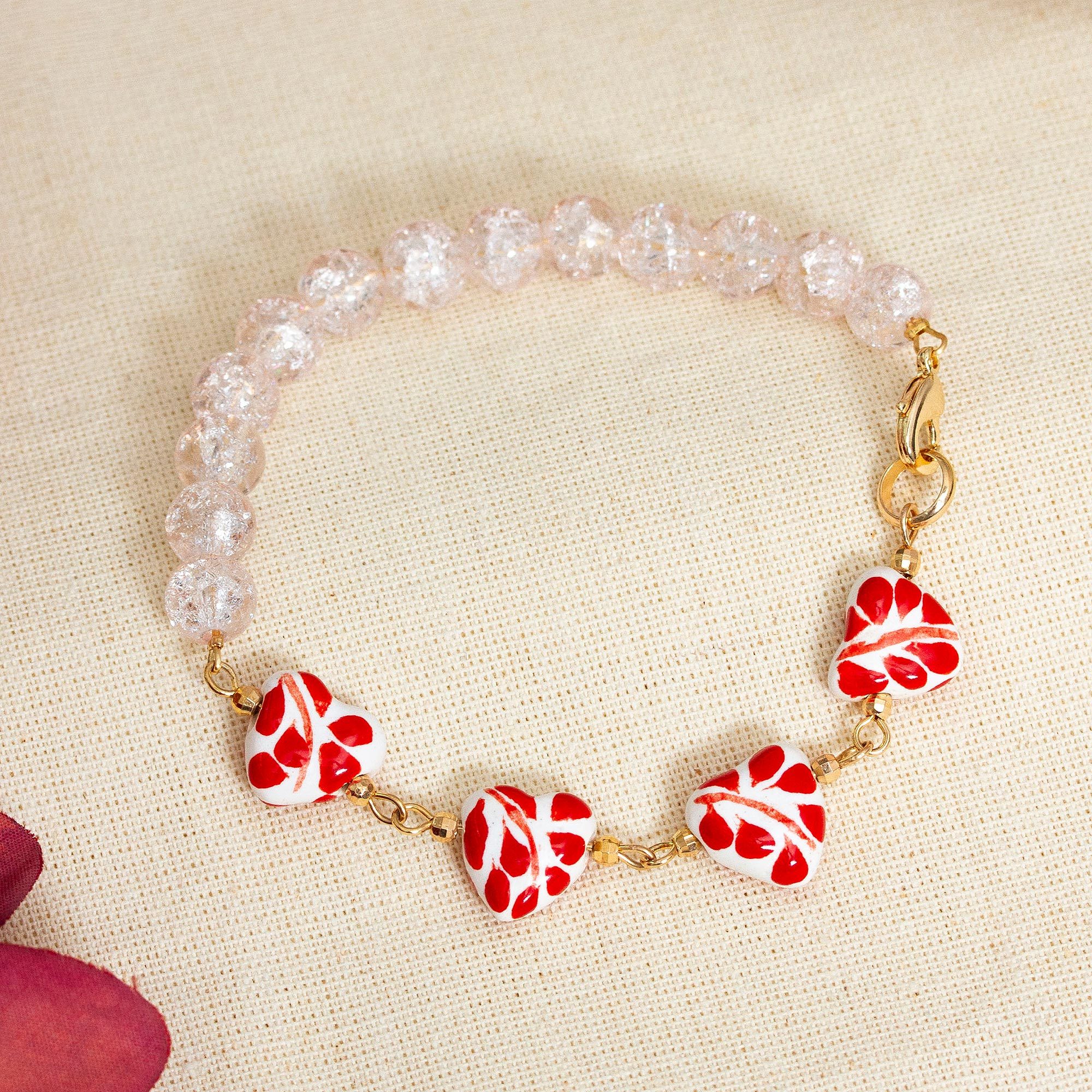 Heart-Themed Talavera Red Ceramic and Crystal Link Bracelet, 'My Red Romance'