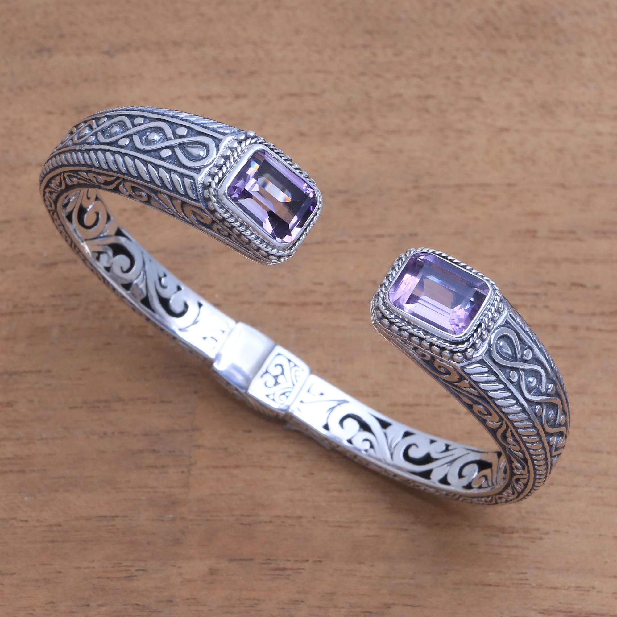 Capped by 5.5 carats of sparkling amethyst gemstones, this cuff bracelet from Bali is designed by Wayan Neri. The cuff is crafted of sterling silver with intricate helix patterns. On the inside of the bracelet are hidden openwork vine motifs. This bracelet opens with a concealed hinge to fit the wrist.