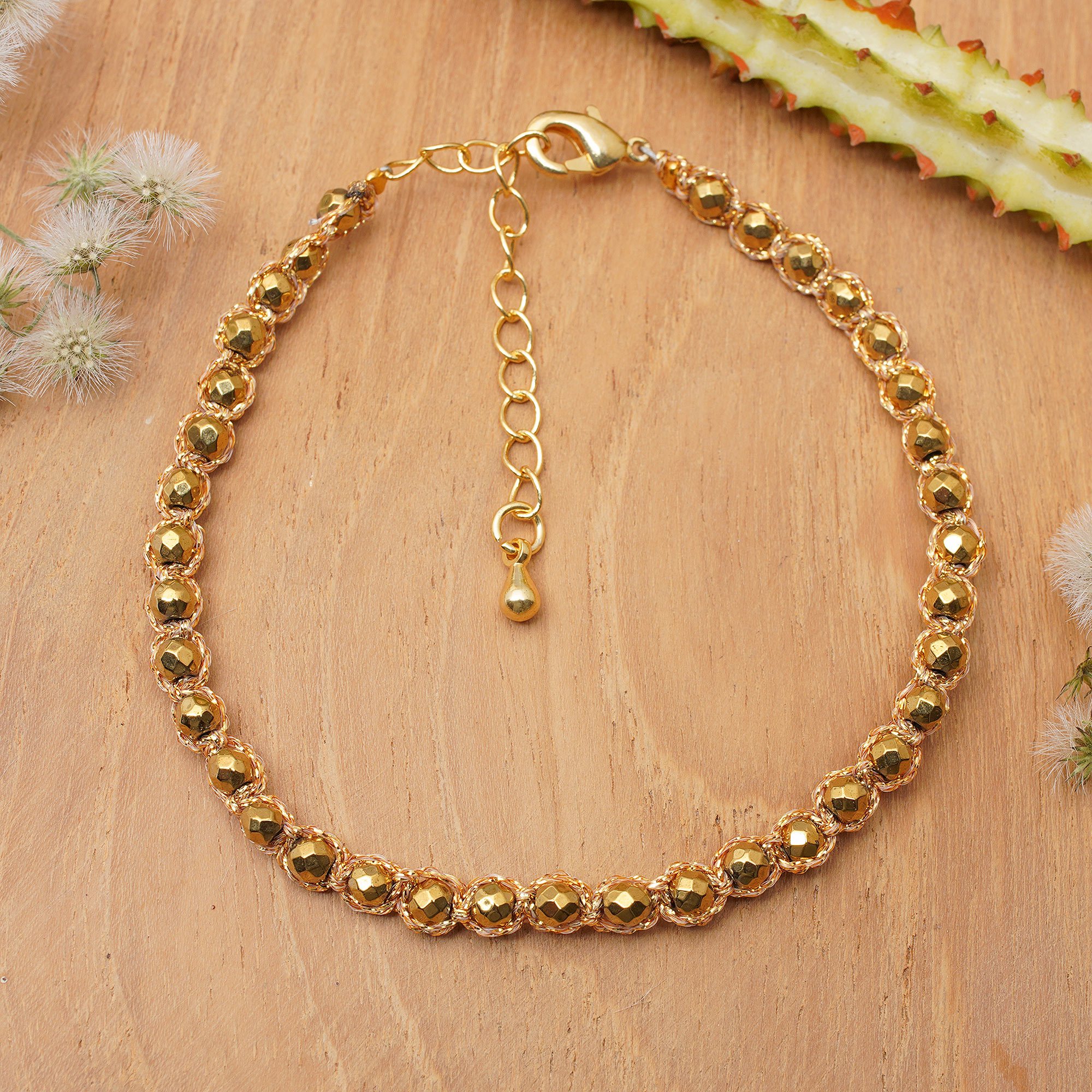 Hematite Beaded Macrame Bracelet with Gold-Plated Clasp, 'Blissful Gleam'
