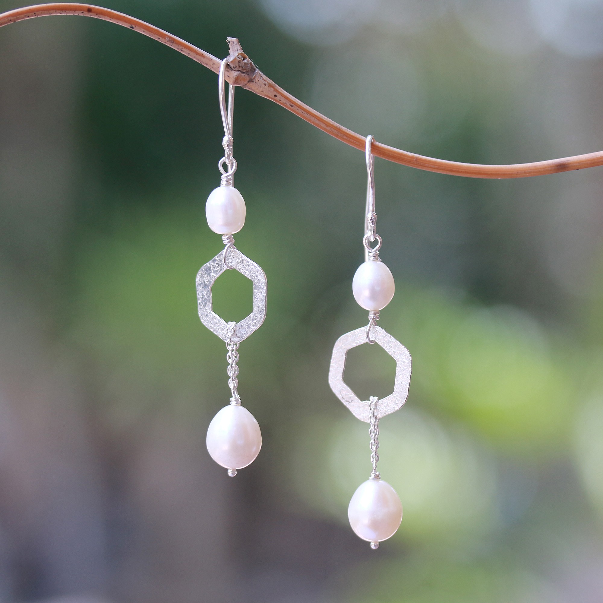 Hexagonal Cultured Pearl Dangle Earrings from Bali, 'Hexagon Glow'