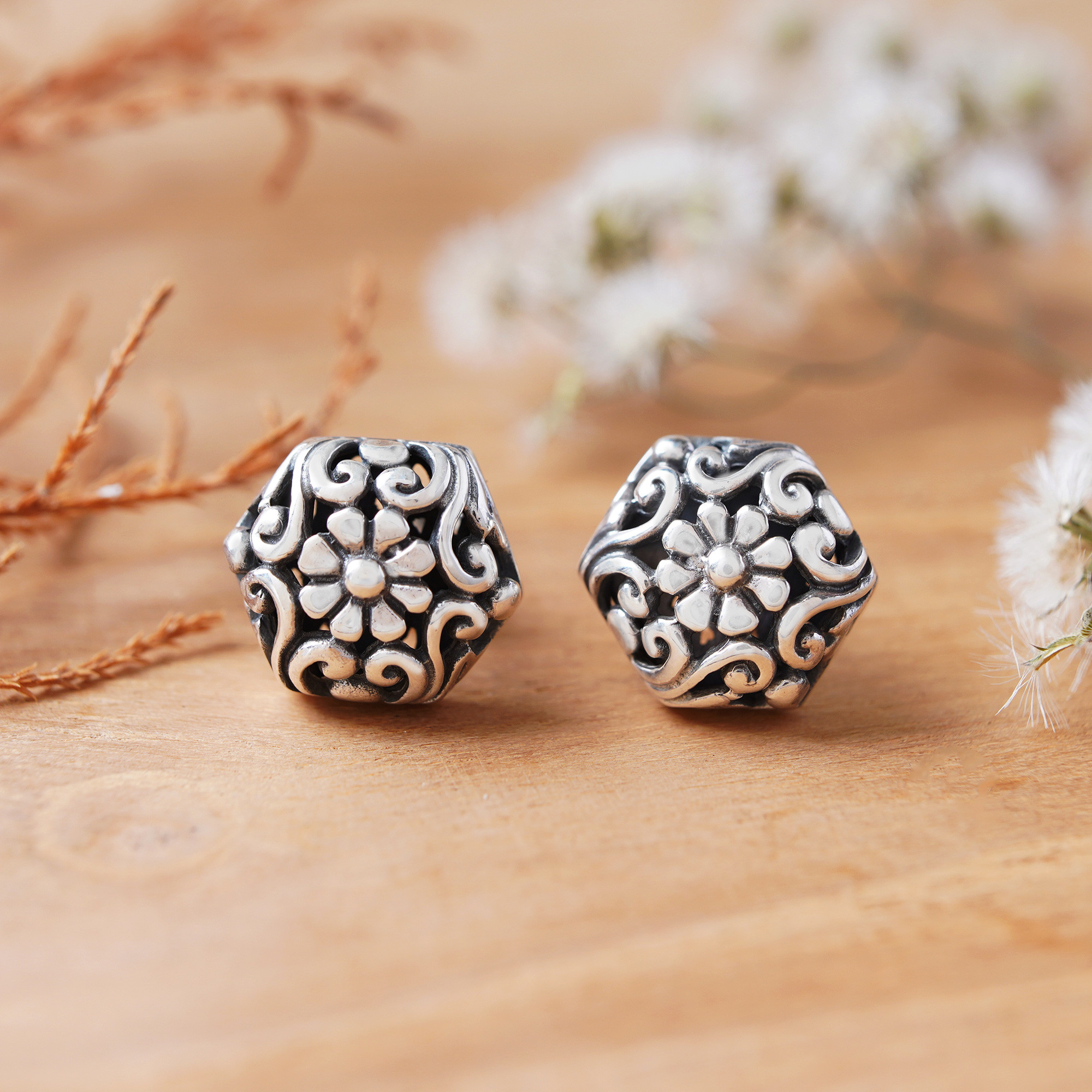 Dainty hexagons are filled with curling vines and centered by daisies in these pretty earrings from Bali's Kadek Wijanegara. The earrings are crafted by hand from sterling silver and rest securely on silver posts.