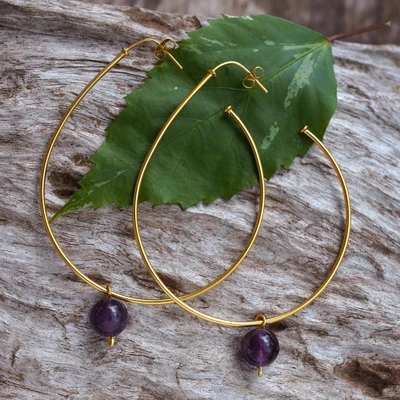 High-Polished 18k Gold-Plated Amethyst Half-Hoop Earrings, 'Wise Ideas'