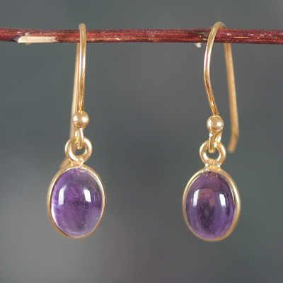 High-Polished 22k Gold-Plated Oval Amethyst Dangle Earrings, 'Golden Wisdom'