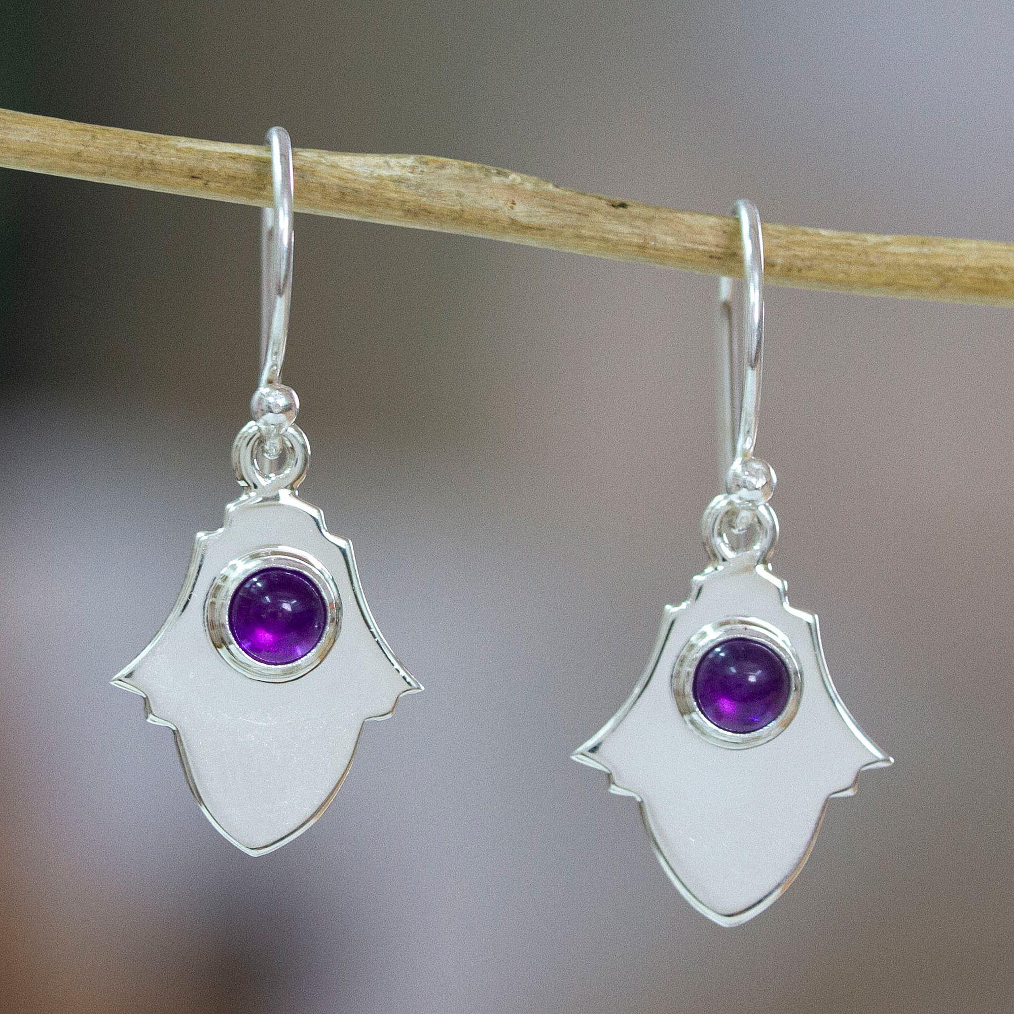 High-Polished Natural Amethyst and Silver Dangle Earrings, 'Wise Alhambra'