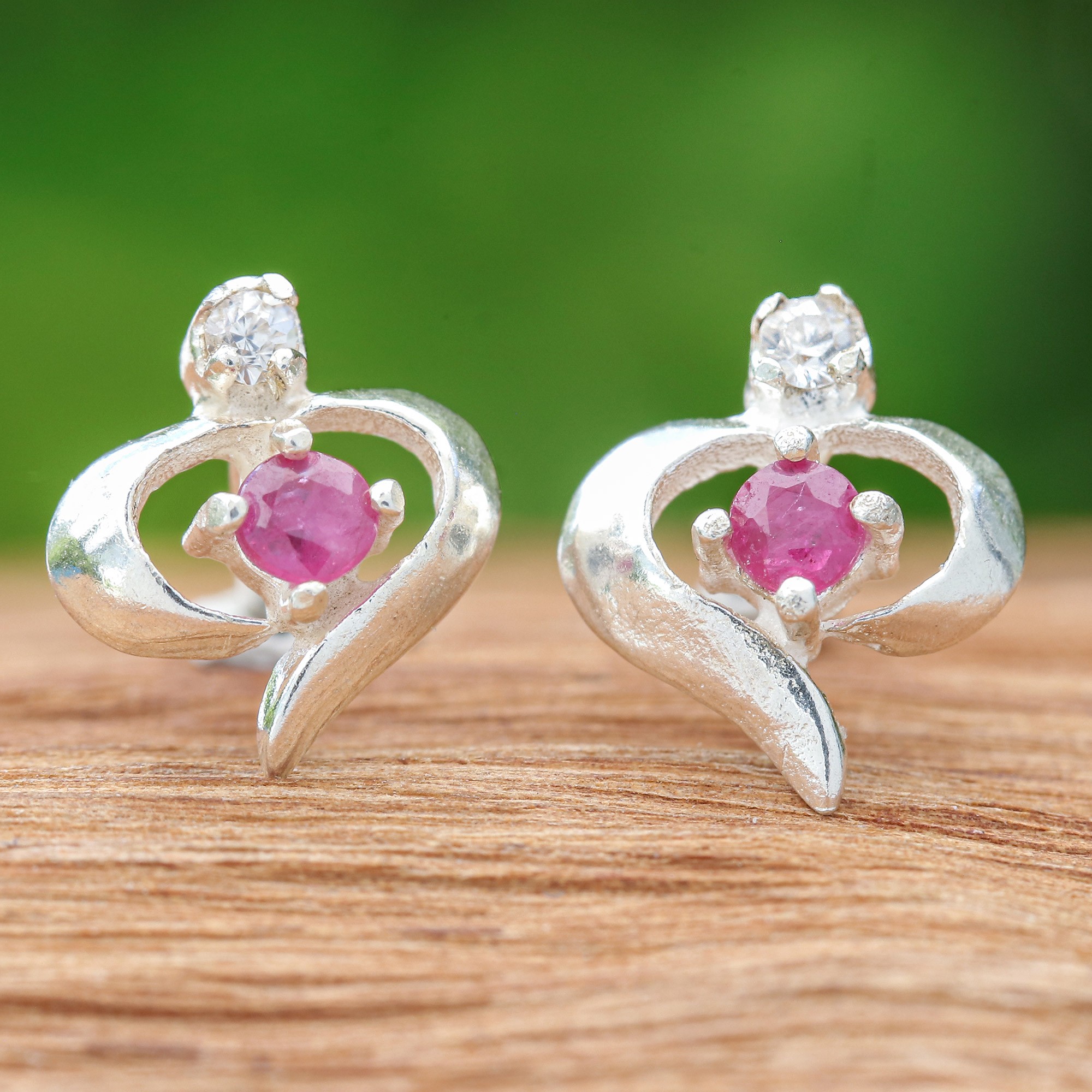 High-Polished Ruby and Cubic Zirconia Stud Earrings, 'The Romance Nimbus'