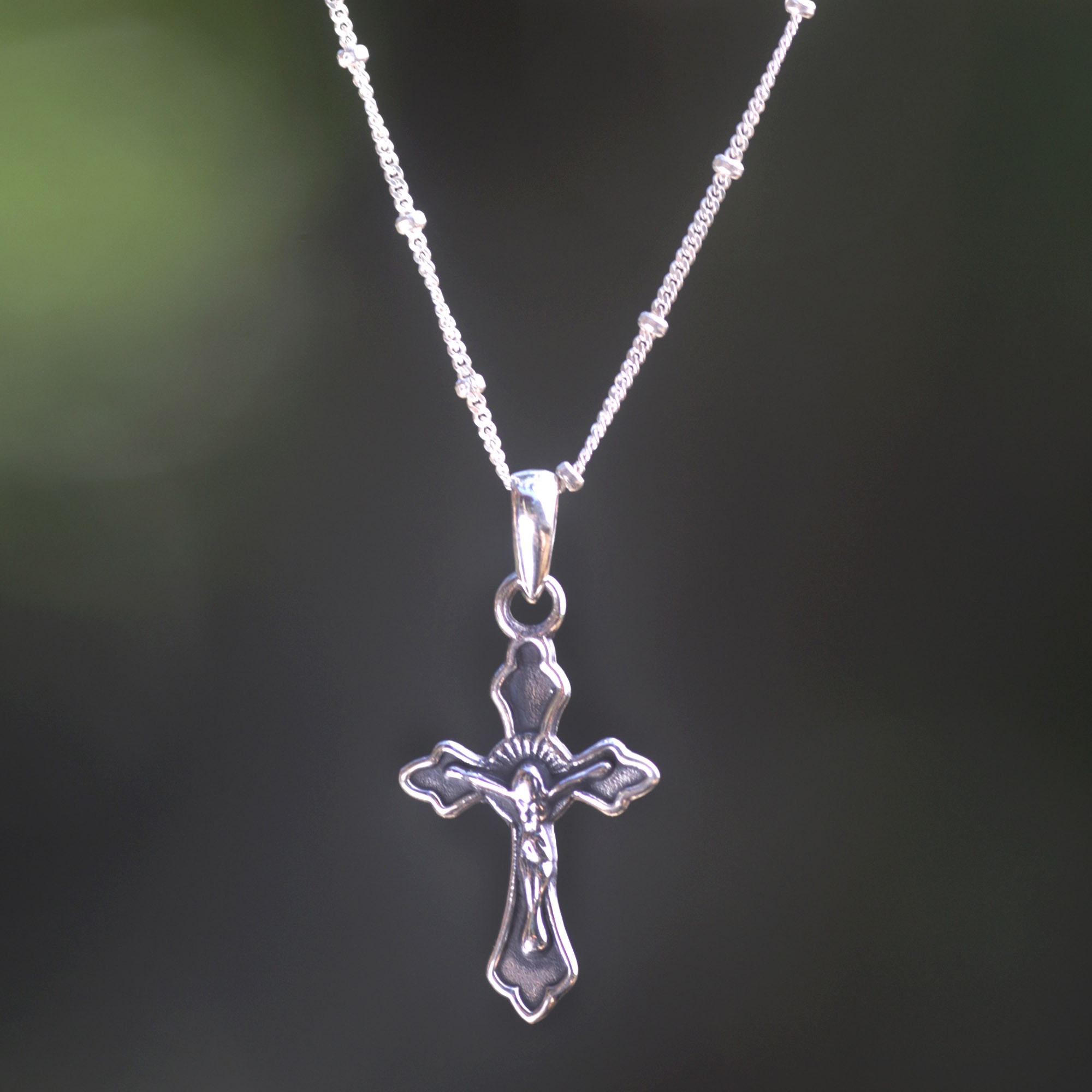 Indonesian artist Made Sri is never one to sit still, and has turned this motivation towards crafting. The resulting culmination of practice means that even with the most simple of designs such as this necklace's crucifix theme, master craftsmanship shines throughout. A Cuban style chain with intermittent beads suspends the oxidized and polished crucifix in a beautifully subtle manner.