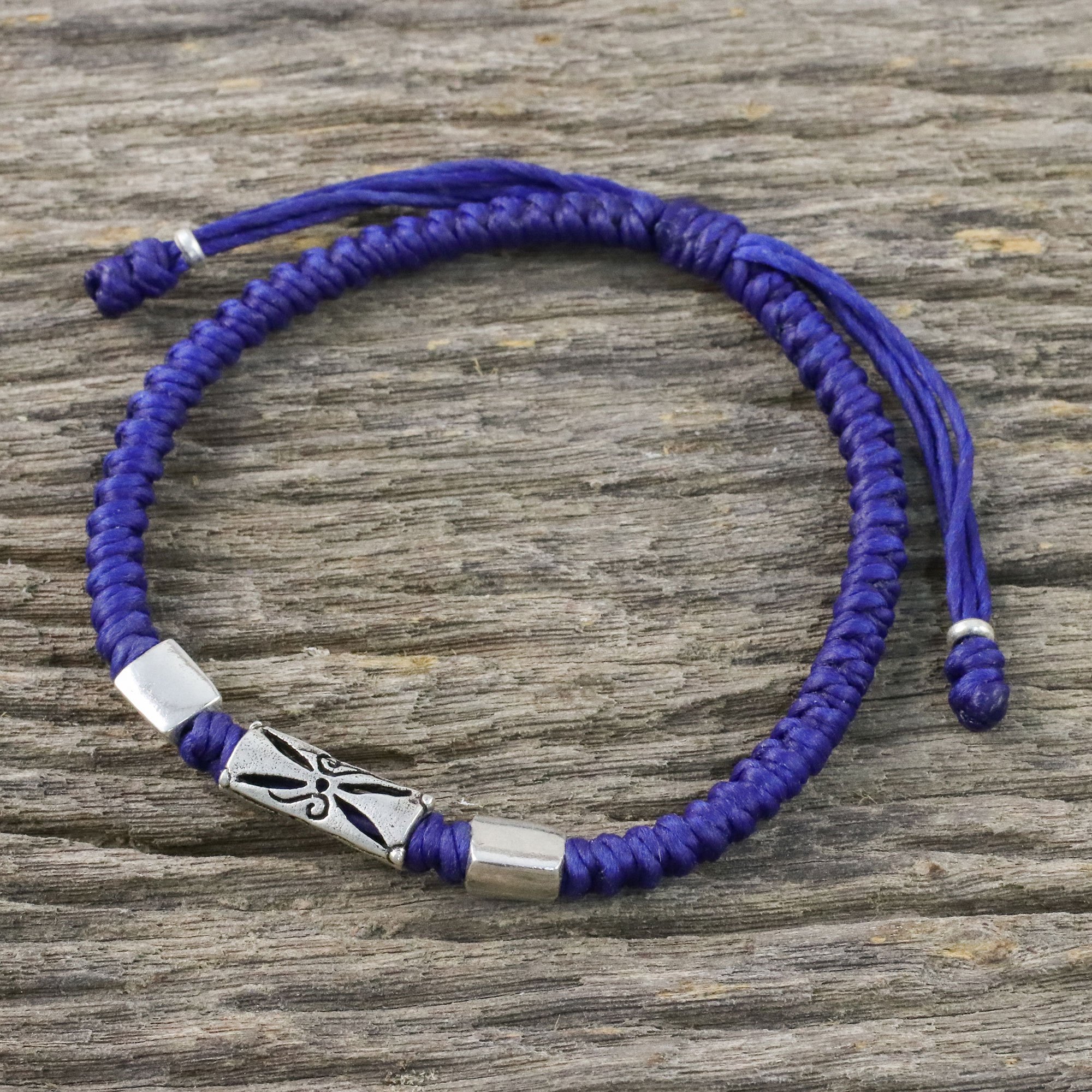 Napapat of Thailand utilizes the unique silversmithing skills of Karen hill tribe artisans in creating this bracelet. The blue cords are hand-braided, and then adorned with triangular 950 silver beads. The central bead features etched and carved motifs. A sliding knot ensures the perfect fit.
