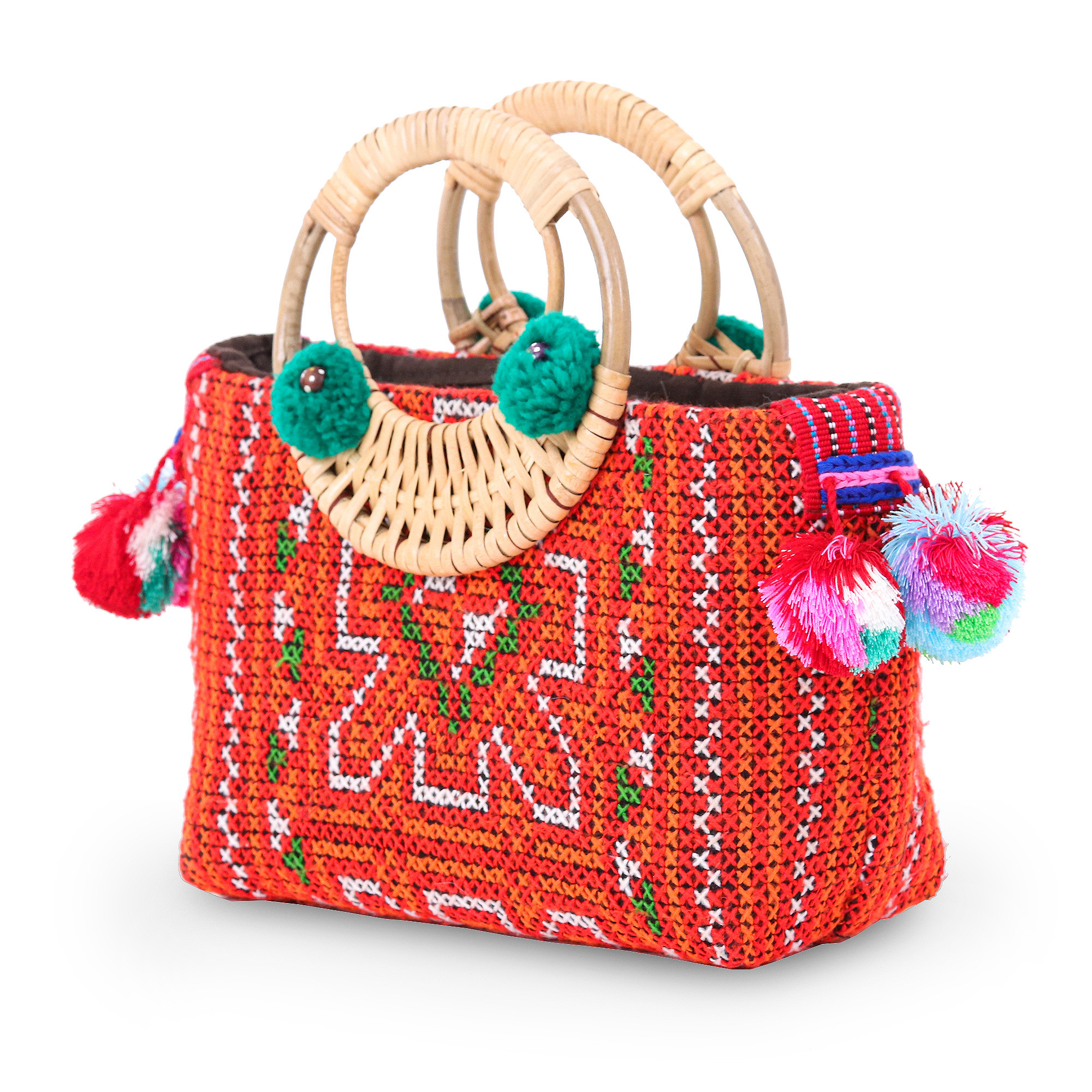 • 50% cotton, 50% hemp; rattan reed handles; cotton lining and pompoms; wooden beads