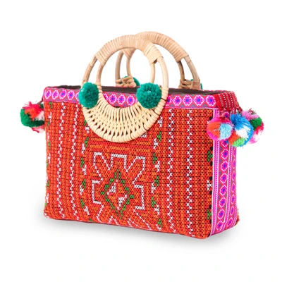 Intricate geometric patterns frame a stunning floral-inspired motif on this hill tribe cotton and natural fiber bag from Thailand's Kunlaya Pangsiri. It is trimmed with a vibrant hot pink woven band decorated with delicate floral designs, adding an unexpected pop of color that makes heads turn. The reliable rattan reed handles ensure comfortable carrying through busy days and whimsical tassels with tiny wooden beads provide the perfect finishing touch. Inside, the fully lined interior features a practical zippered pocket for organizing essentials, all protected by a secure zippered closure that keeps everything in place. This boho chic bag bridges cultures while delivering everyday functionality with unmistakable style.