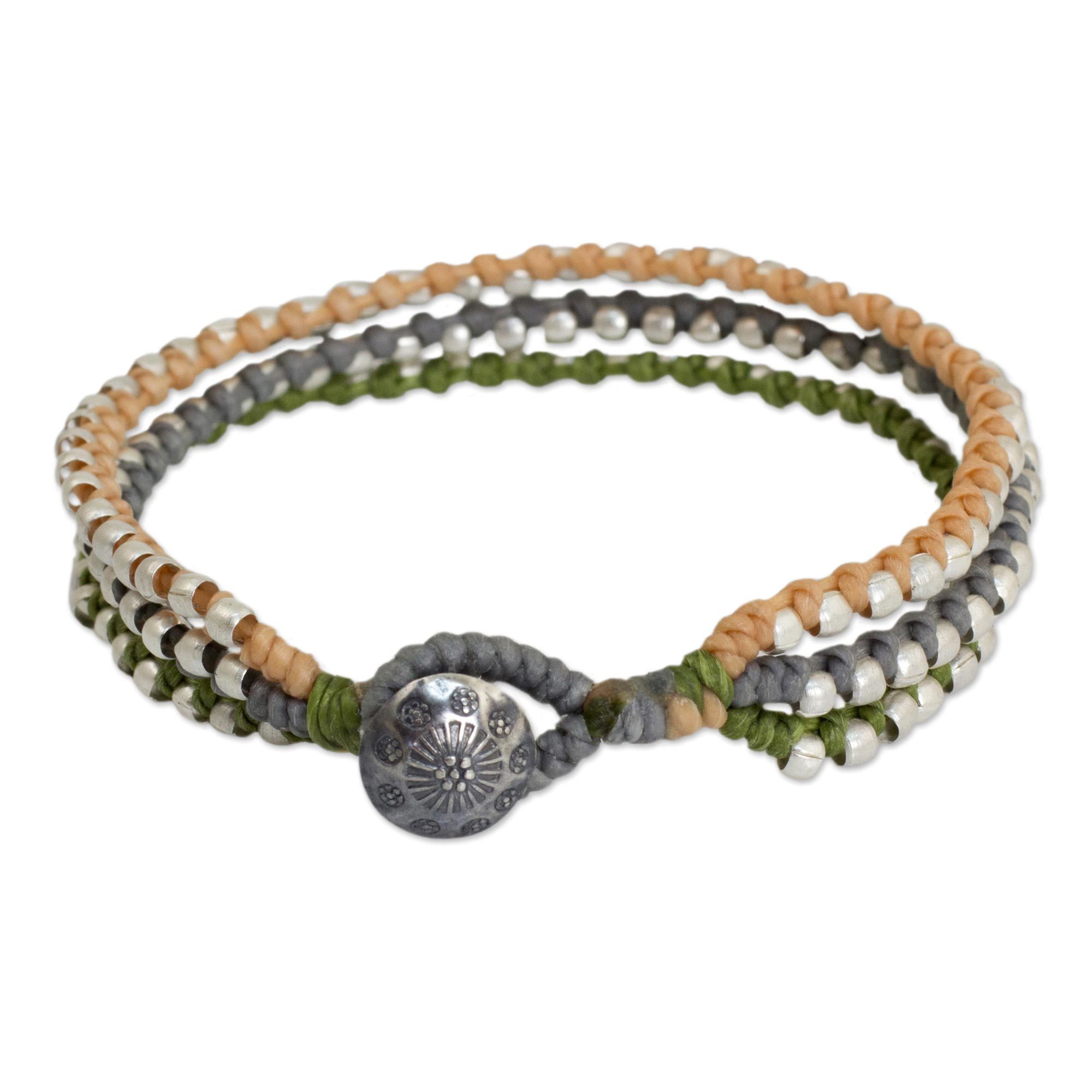 In shades of gray, green and peach, this wristband bracelet is by Thailand's Napapat. She knots the three bracelets by hand along with matte beads of sterling silver plated brass. The bracelets are joined into one at the button clasp.