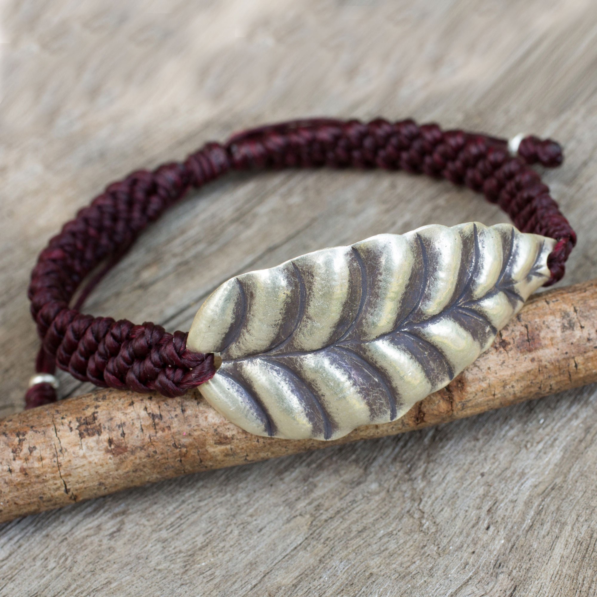 A leaf of rugged beauty centers this wristband bracelet from Thailand. The silver pendant is crafted by talented silversmiths from the Karen hill tribe. Napapat crafts the burgundy bracelet by hand with macramé techniques.