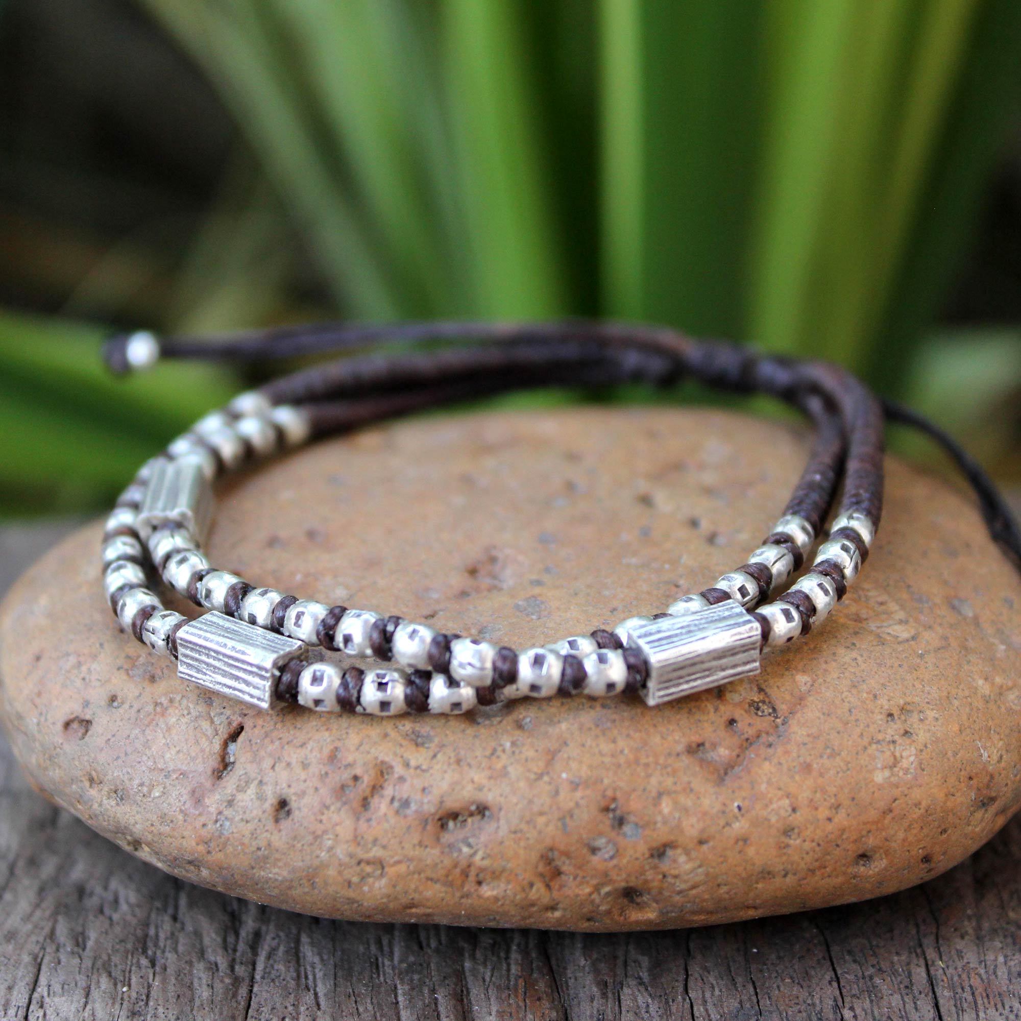 Silver beads reveal the artistry of Thailand's hill tribes, each one engraved by hand. By Napapat, this textured bracelet is knotted by hand with two opulent strands of beads. The length can be adjusted by sliding the knot along the dark brown cords.