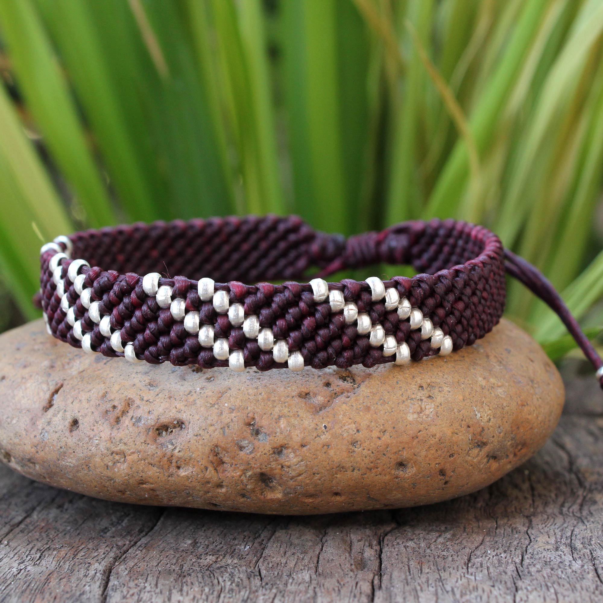 Knotted by hand on fuchsia cords, shining silver beads form diagonal rows. Napapat showcases the silver art of Thailand's Karen hill tribe. This beautiful macrame bracelet slips over the wrist, and the length can be adjusted by sliding the knot along the cords.