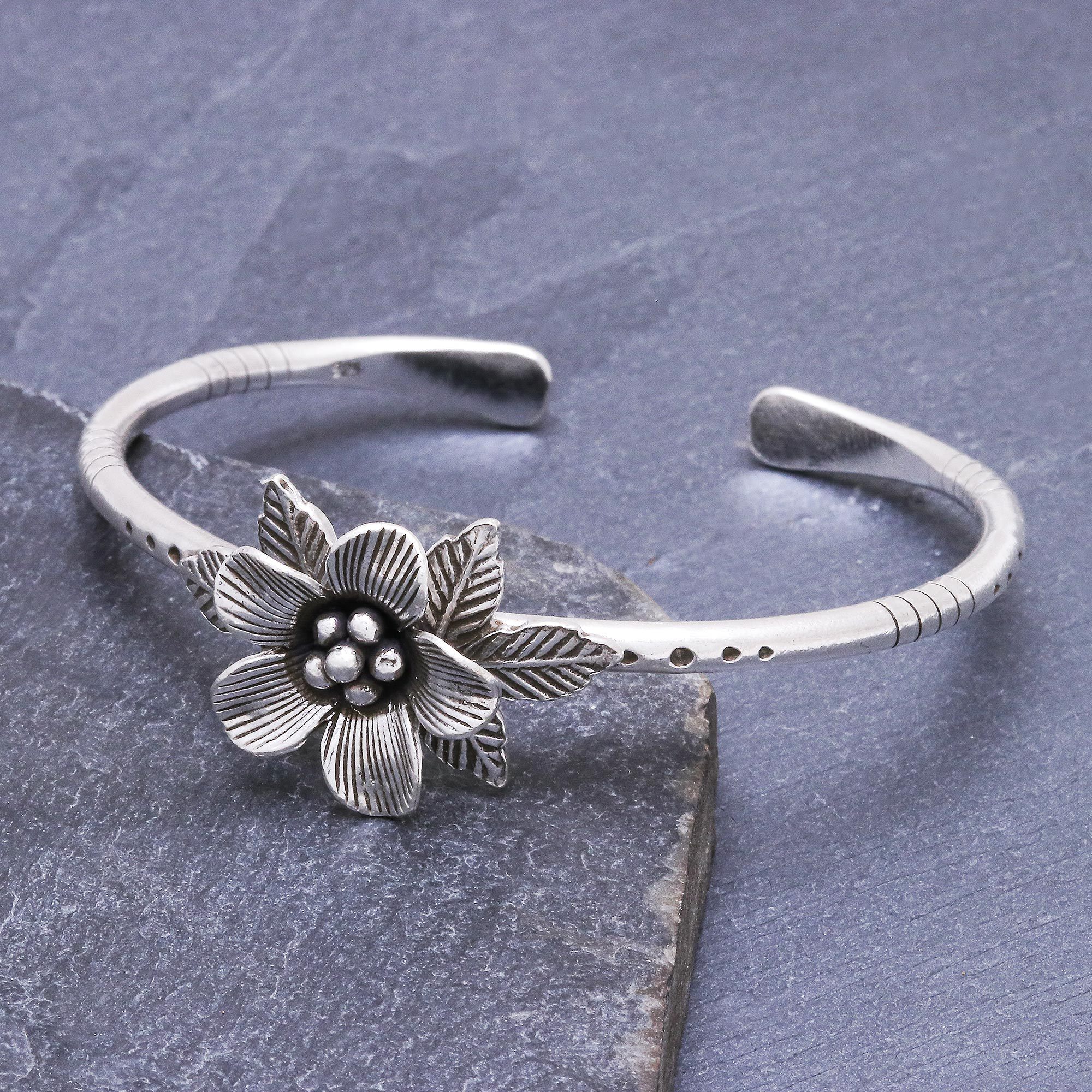 Hill Tribe Style Sterling Silver Floral Cuff Bracelet, 'Winter Flower'
