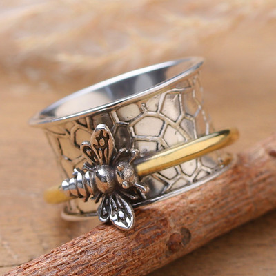 Honeycomb-Themed Sterling Silver and Brass Meditation Ring, 'Honeycomb Bee'