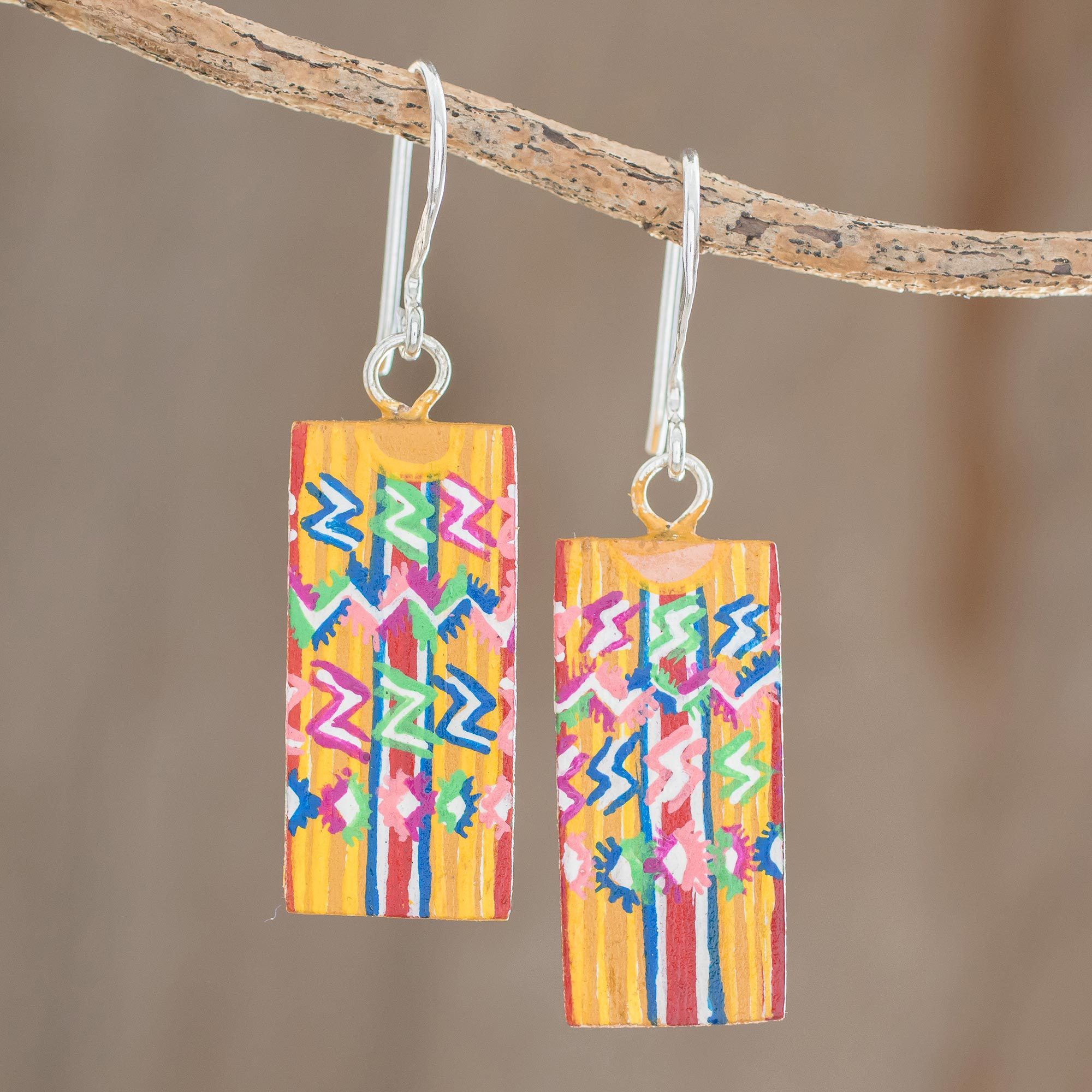 Inspired by the cultural richness of the town of Tecpan, Guatemalan artisan Meliza Tzay designs and crafts this pair of dangle earrings. Two rectangles are crafted from cedar wood, painted by hand with colorful designs that evoke traditional Guatemalan huipil blouses.