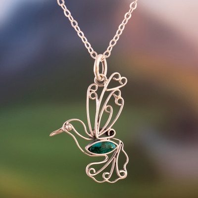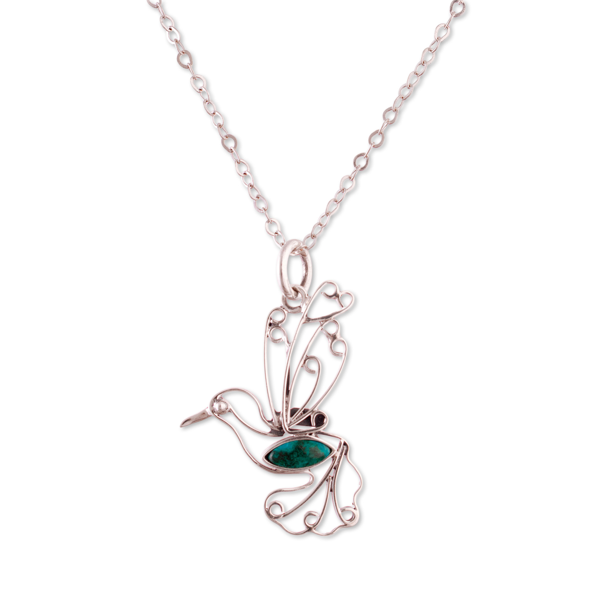 Fine lines of sterling silver draw the ethereal silhouette of a hummingbird, flying to the Andean paradise. Artisan Nancy Quispe works with dedication on this pendant necklace, whose intricate details capture the essence of the Peruvian region, and complete it with a natural chrysocolla jewel.