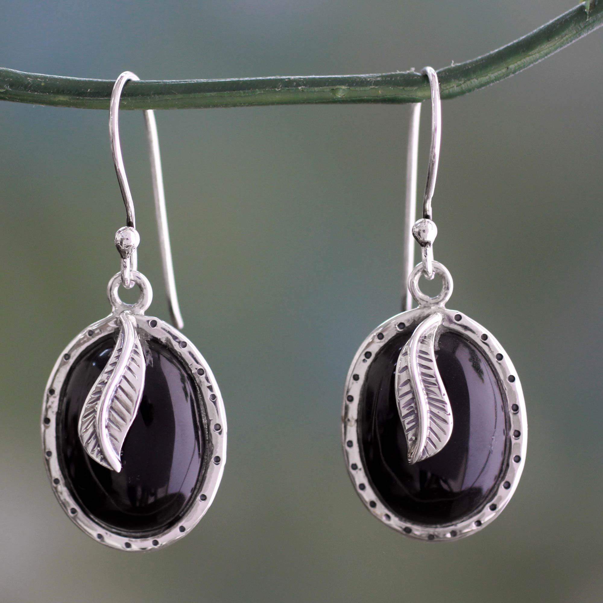 Newly sprouted leaves venture forth, tender and shy. They crown black onyx cabochons in these original earrings from Indian artisan Shanker. The artisan sets the gems in sterling silver and adds a dot motif to the bezel.